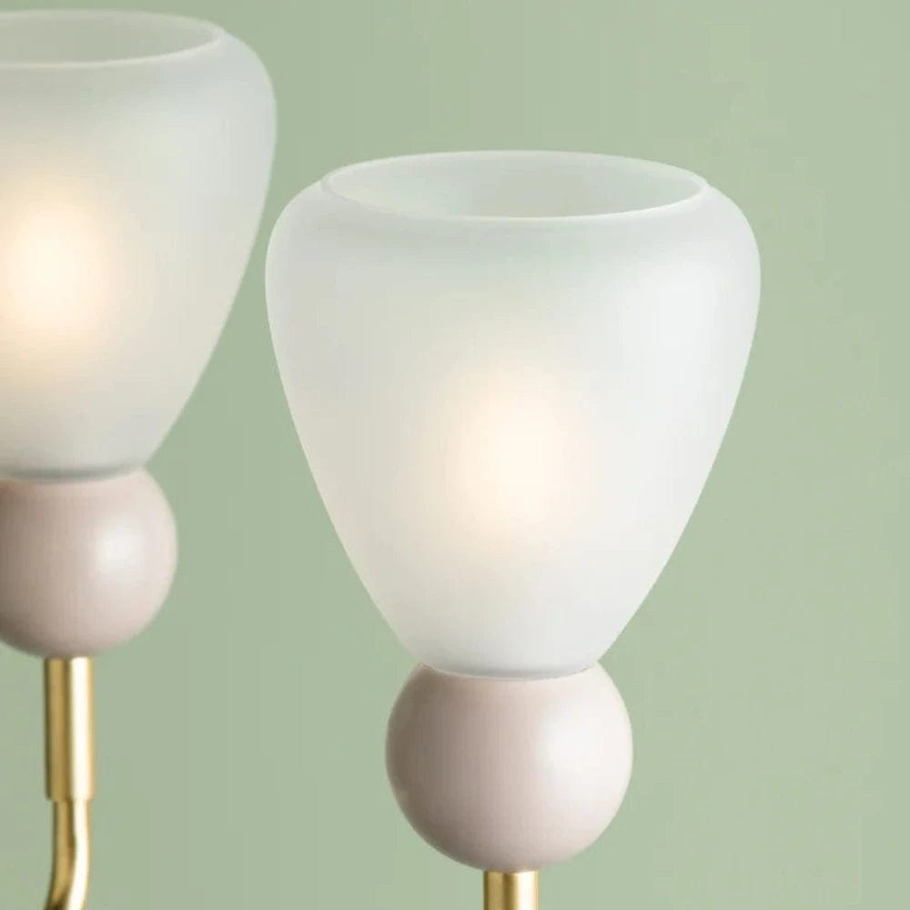 Treading the line between art and design, Doreen combines sleek Aged Brass metalwork with whimsical details. Conical shades cast from etched matte glass diffuse light over a large area while serving as a focal point. Painted peignoir ball details lend a playful charm to this enchanting wall sconce and chandelier.