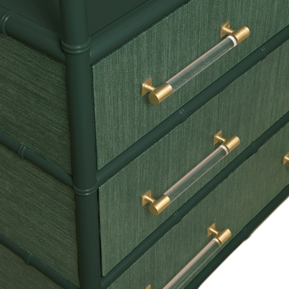 Three drawer etagere with bamboo detail in blue dyed grasscloth and light blue or dark green matte lacquer