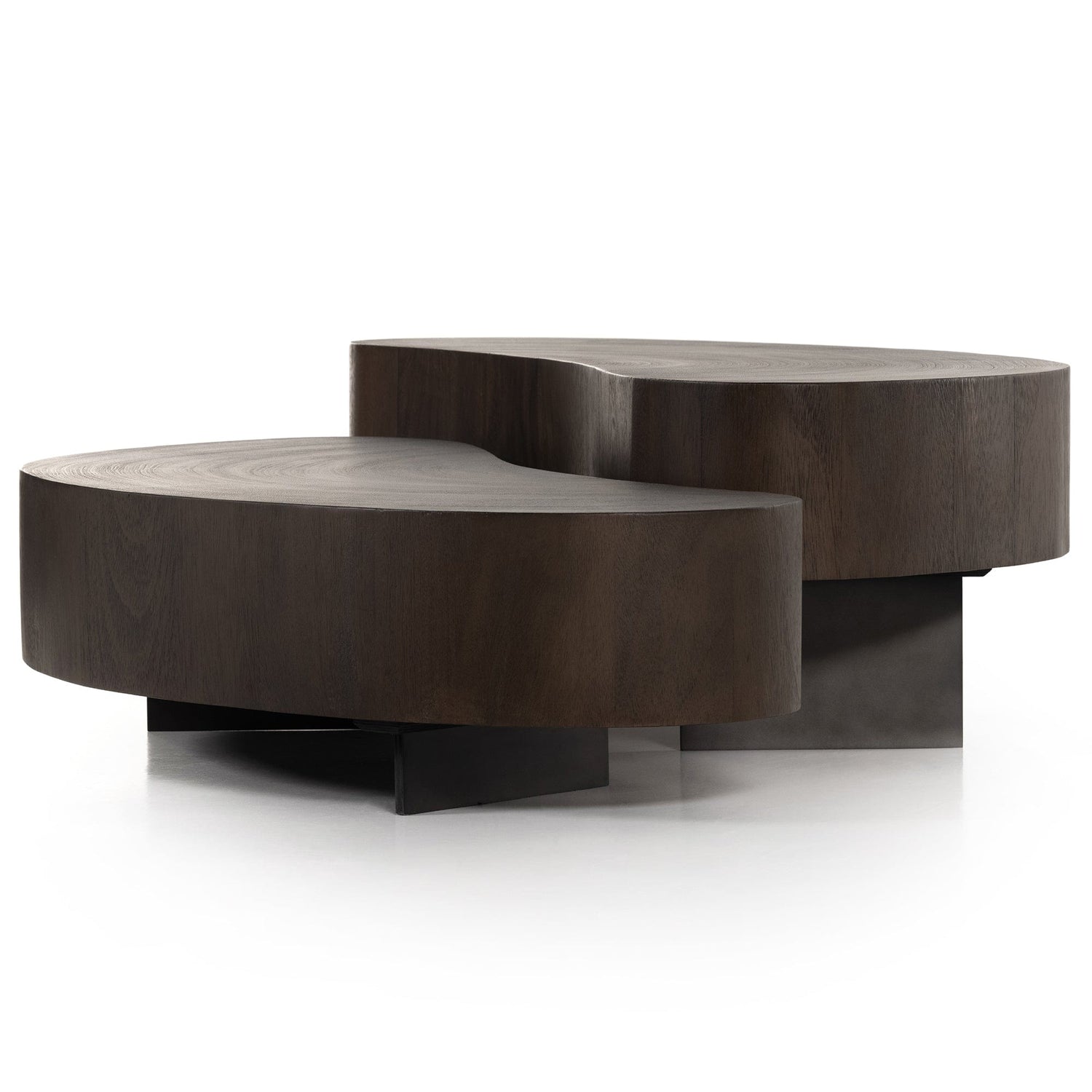 Natural beauty. Total novelty. Oyster-cut Guanacaste forms kidney-shaped coffee tables in varied heights, creating a beautifully layered look. Visible veneer rings speak to woods' natural graining, with a dark gunmetal-finished base.