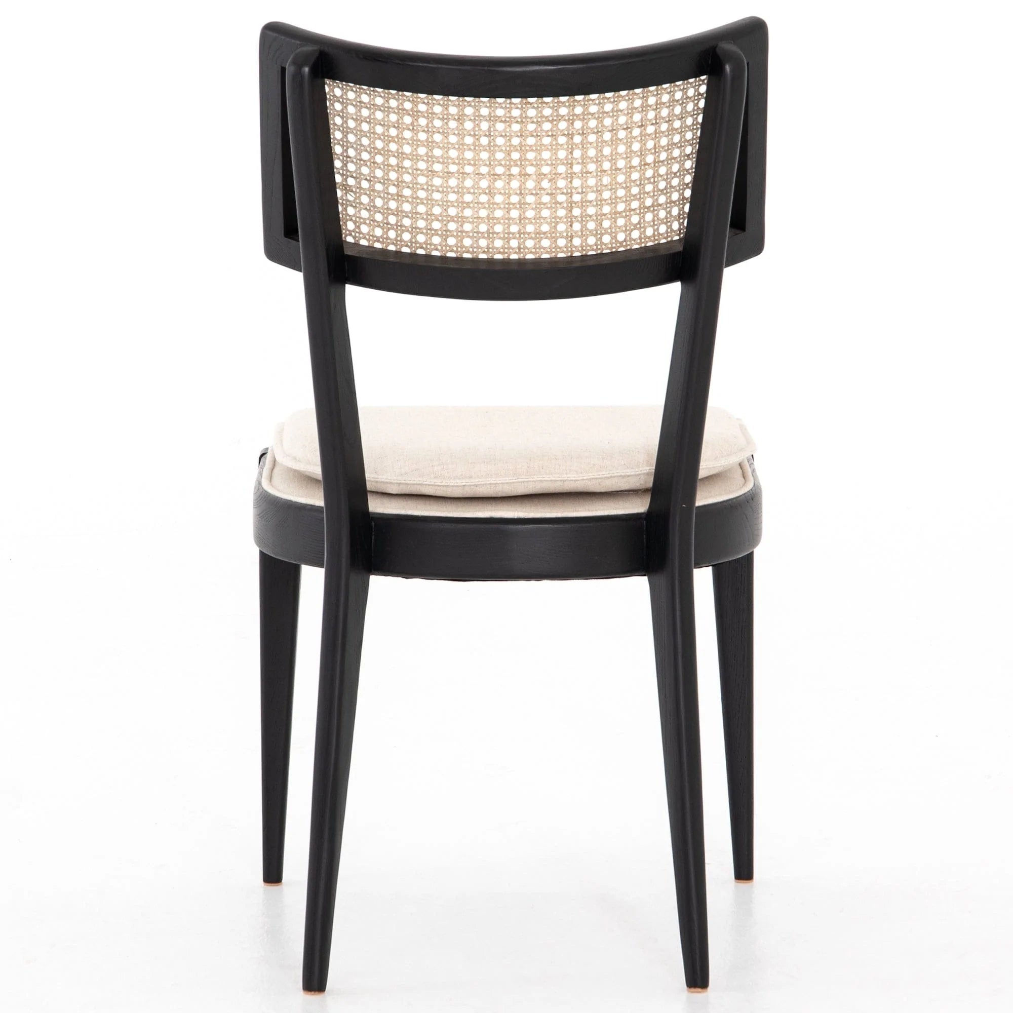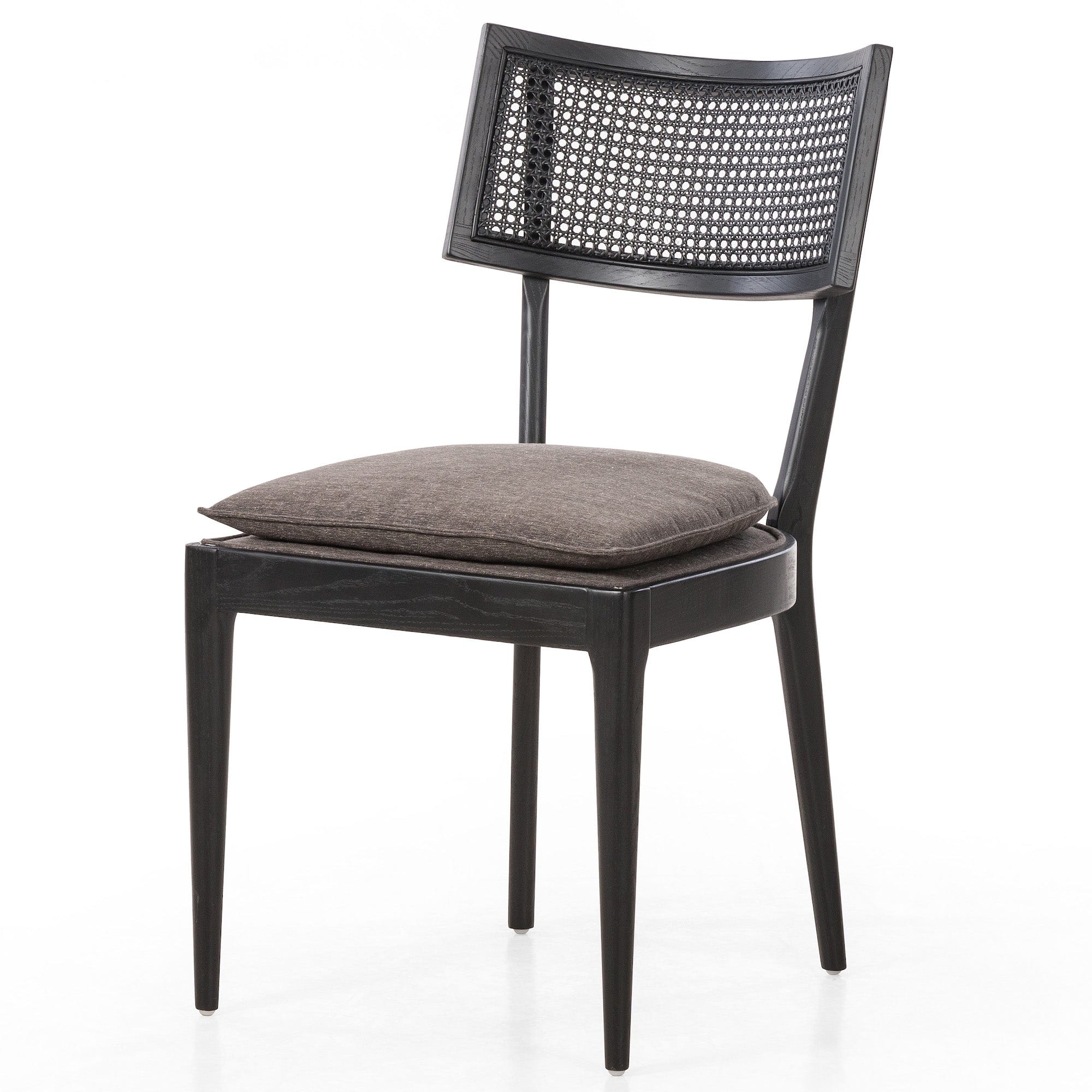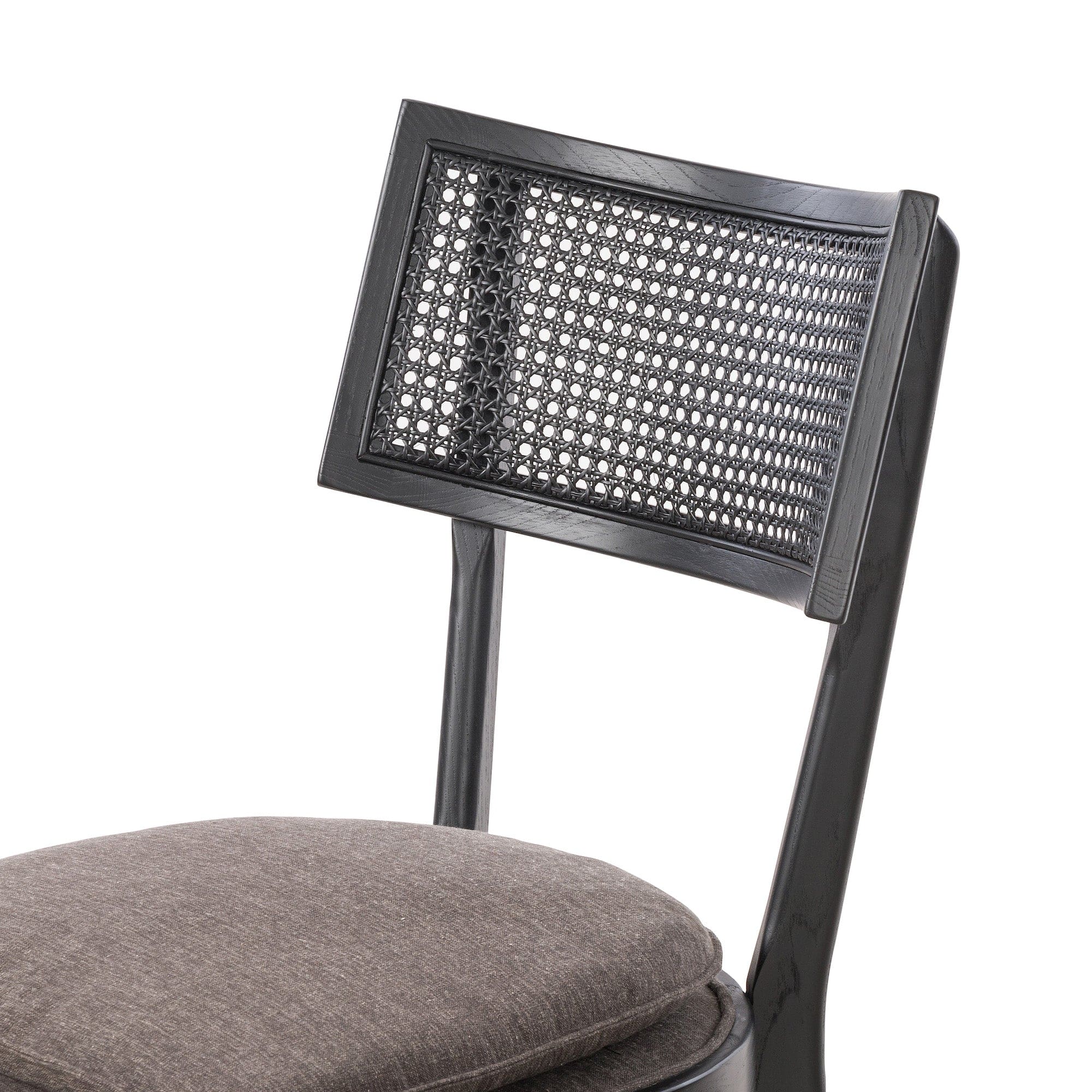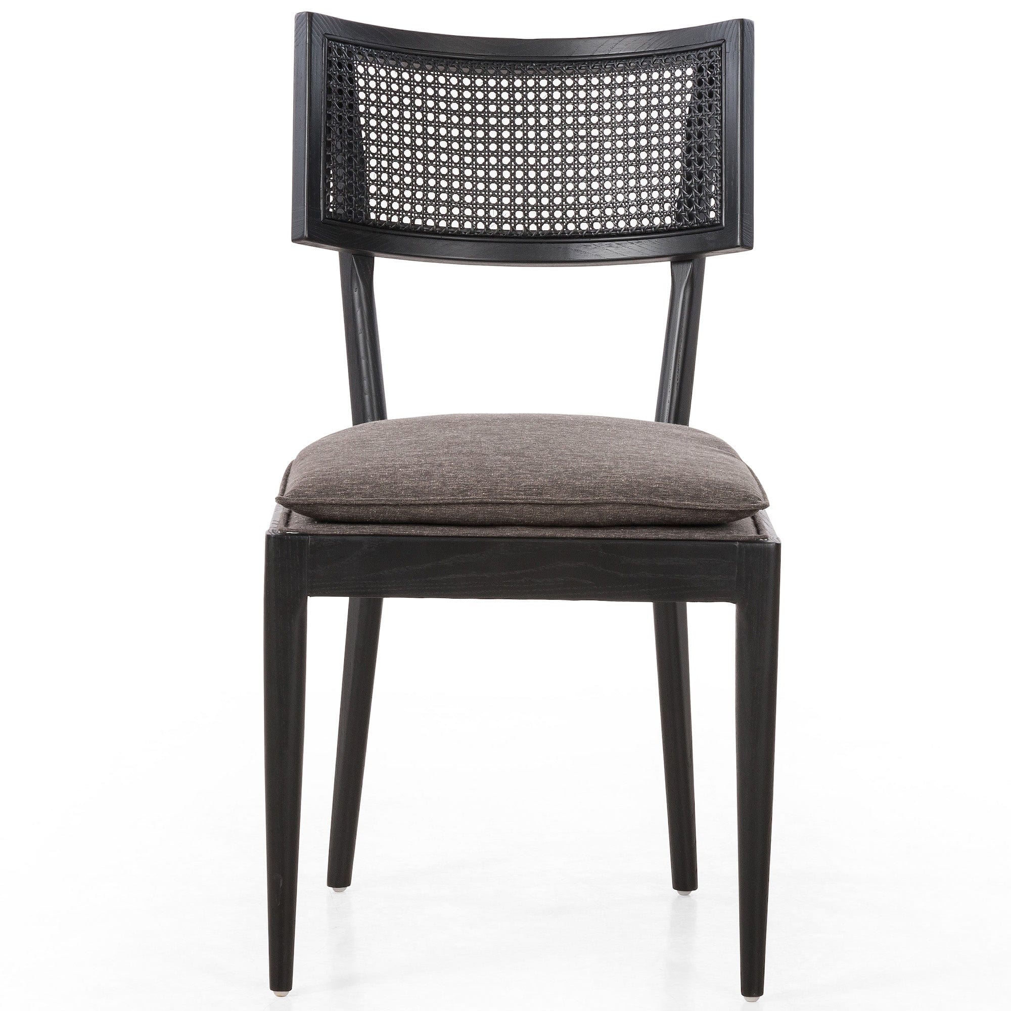 Mixed materials refresh retro dining style. Ebony-finished nettlewood frames a textural inlay of natural cane, for perfect contrast. Fastened by Velcro, high-performance linen-blend seating for modern sensibility. Performance fabrics are specially created to withstand spills, stains, high traffic and wear, ensuring long-term comfort and unmatched durability.