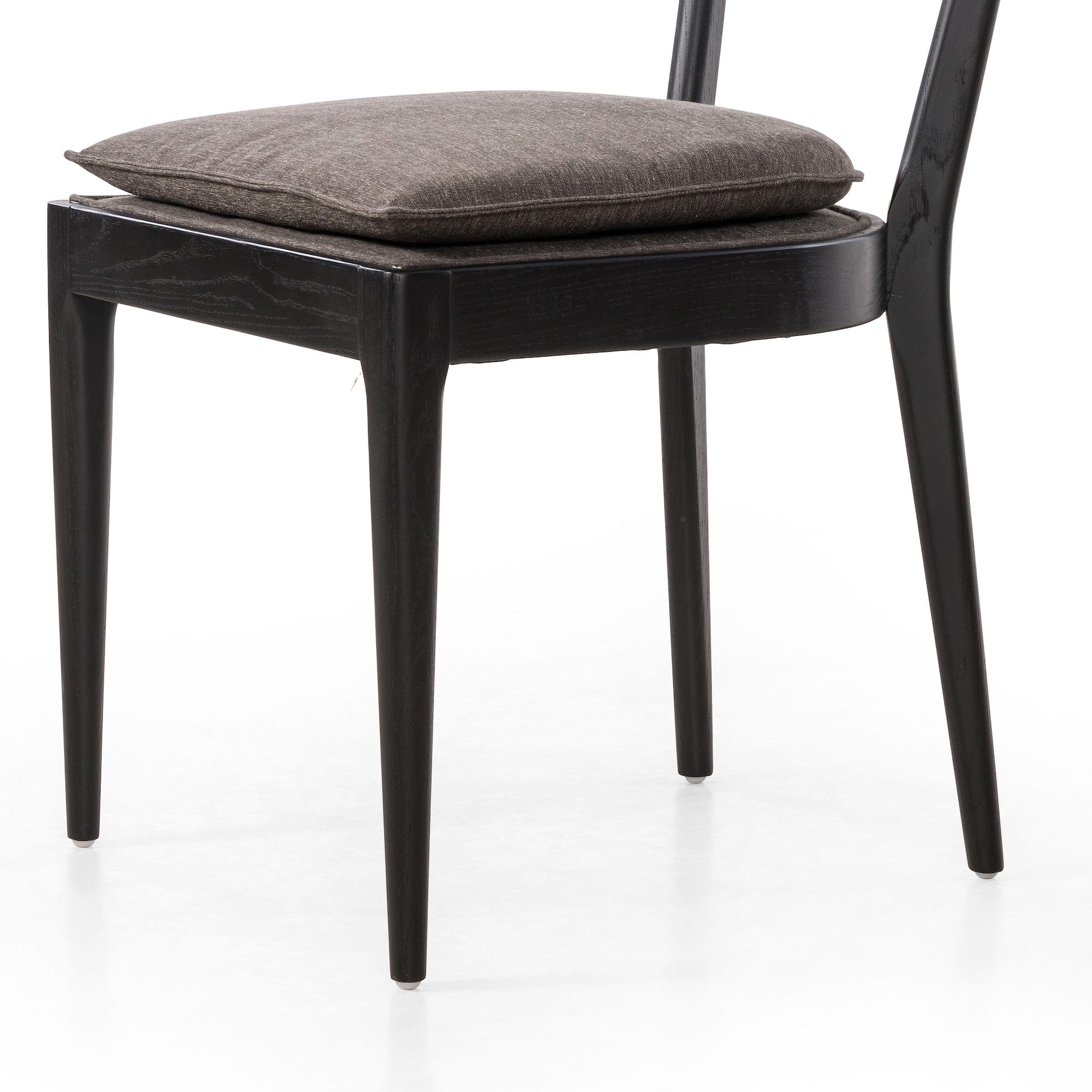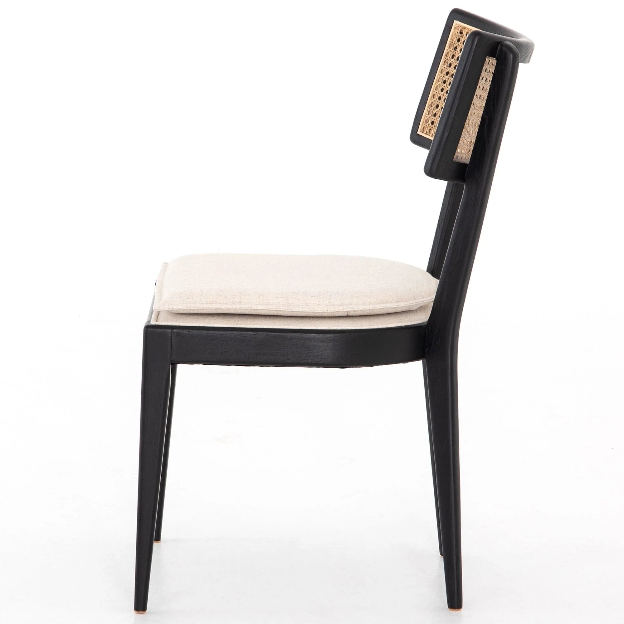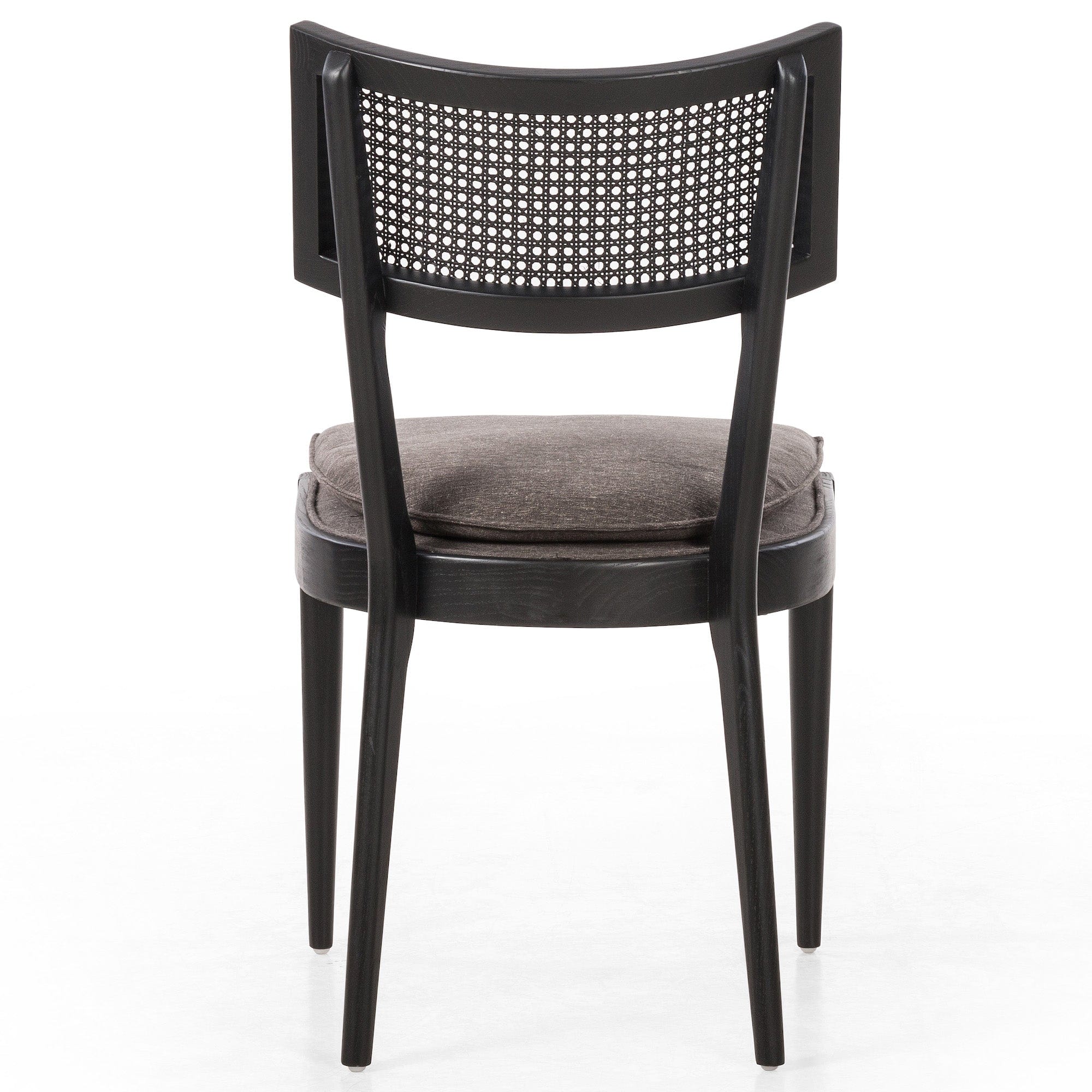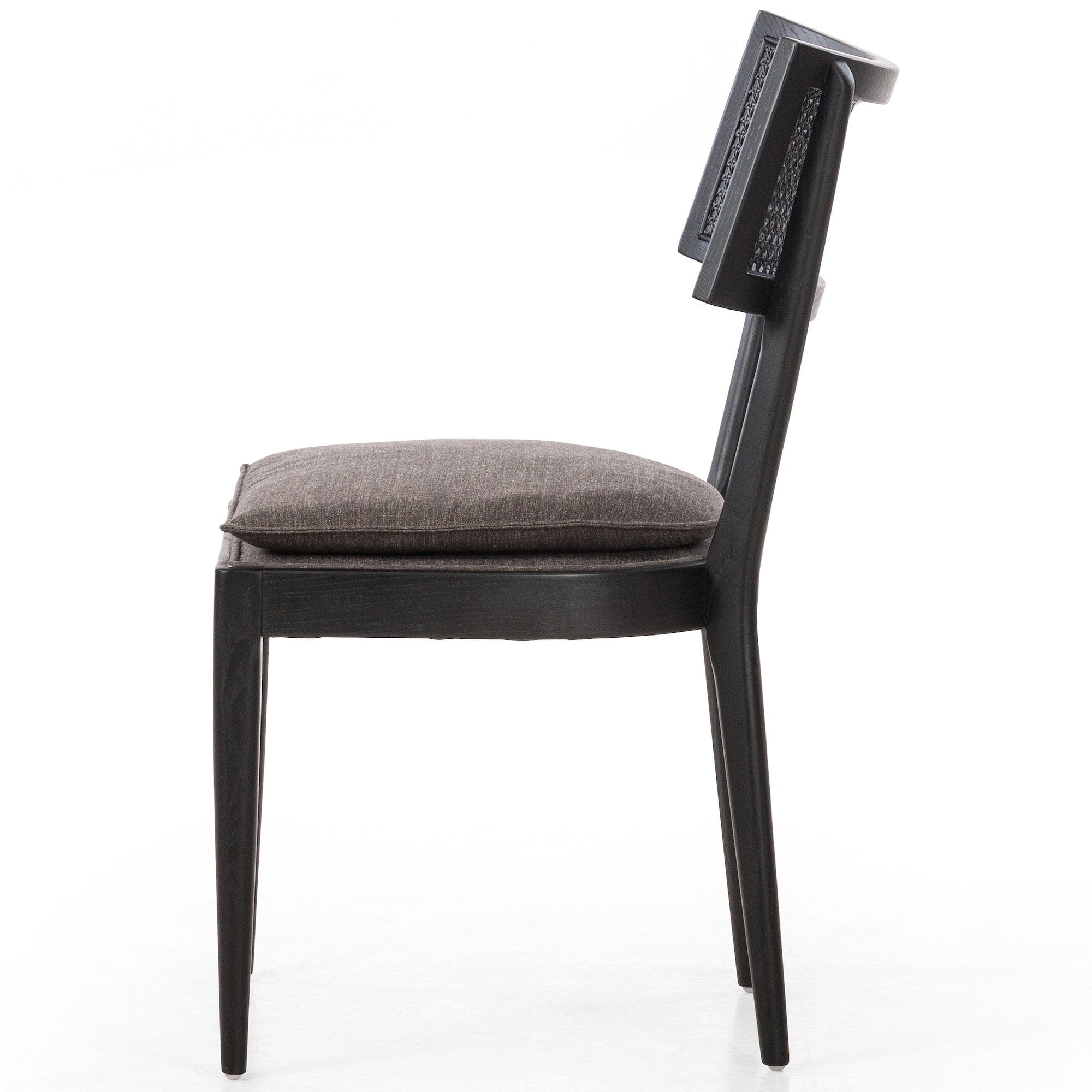Mixed materials refresh retro dining style. Ebony-finished nettlewood frames a textural inlay of natural cane, for perfect contrast. Fastened by Velcro, high-performance linen-blend seating for modern sensibility. Performance fabrics are specially created to withstand spills, stains, high traffic and wear, ensuring long-term comfort and unmatched durability.