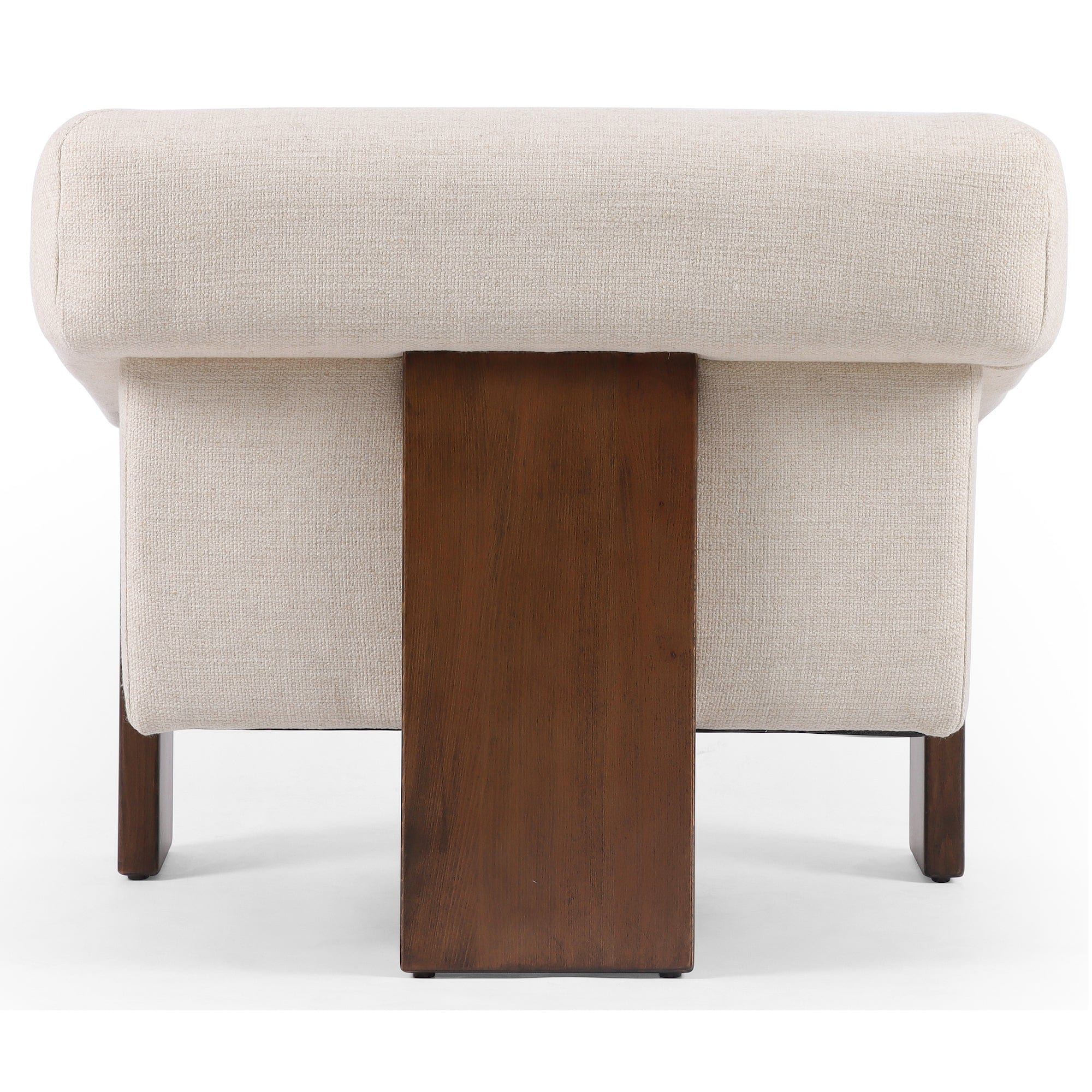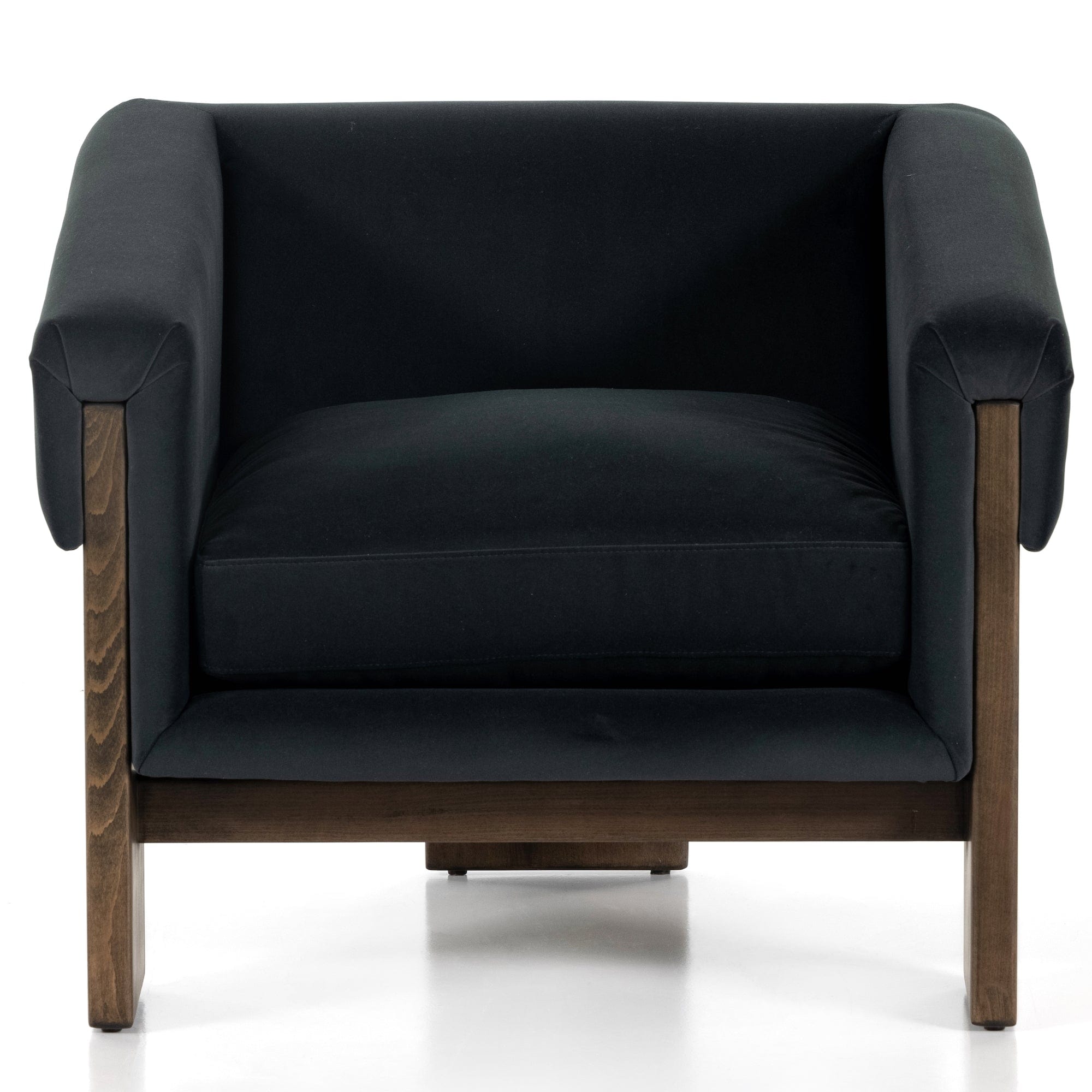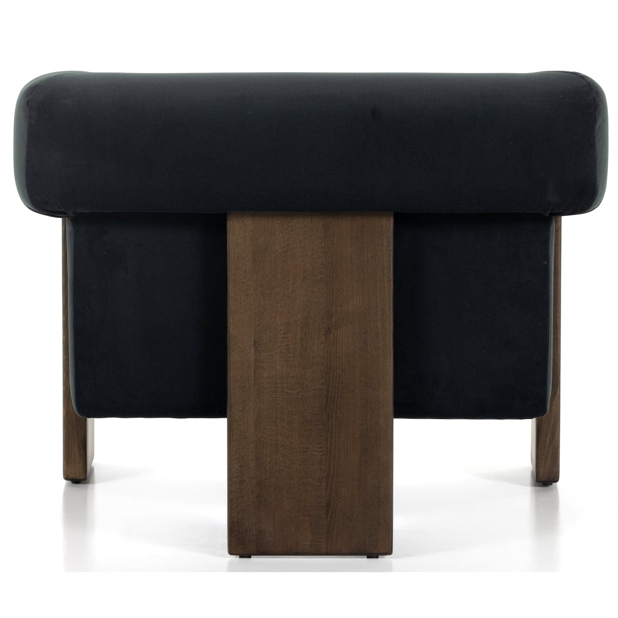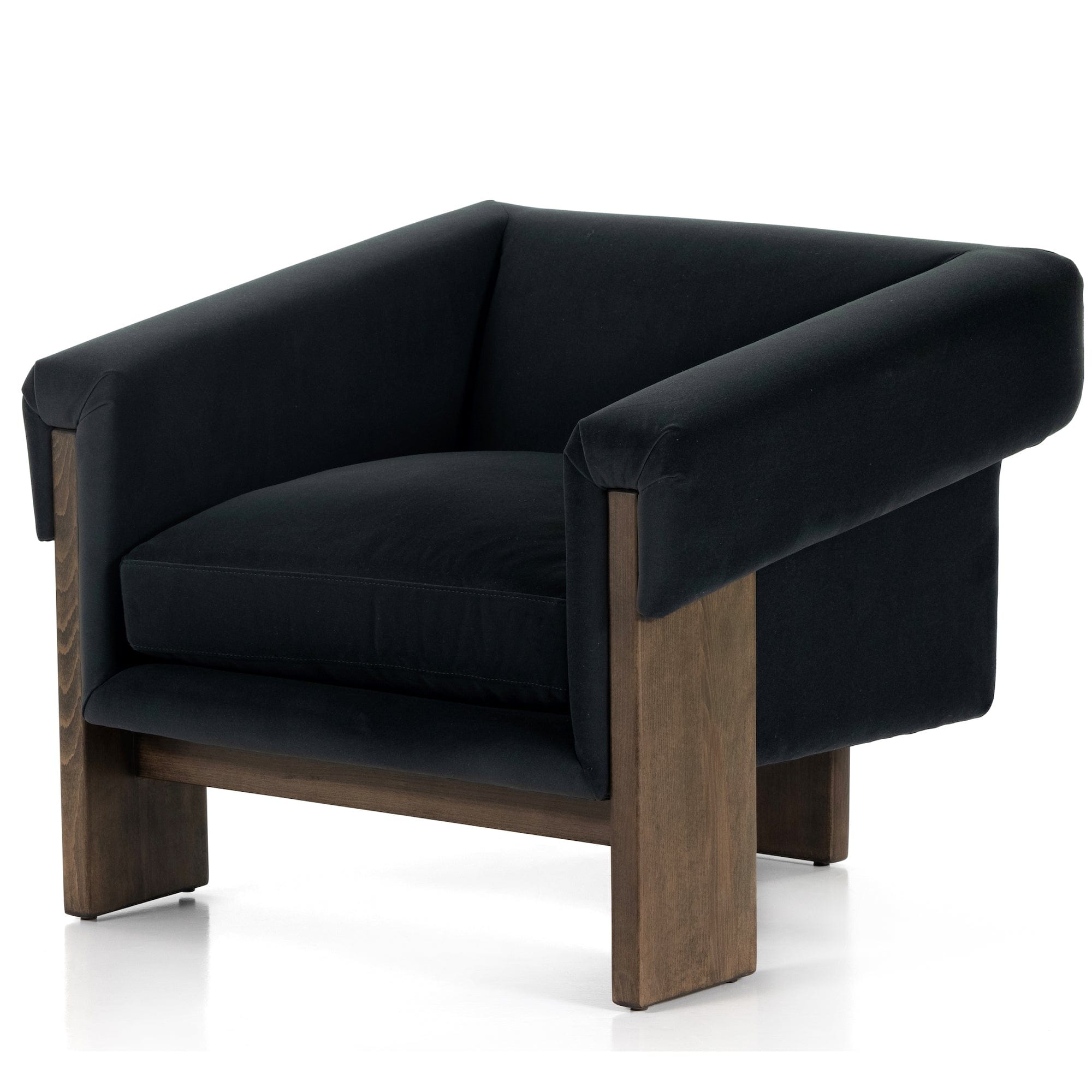 A striking silhouette that commands attention from all angles. Inspired by vintage Brazilian designs, wide plank legs form an architectural tripod and frame for a floating cushioned seat. Tight upholstered back with wraparound arms and a loose, plush seat cushion.