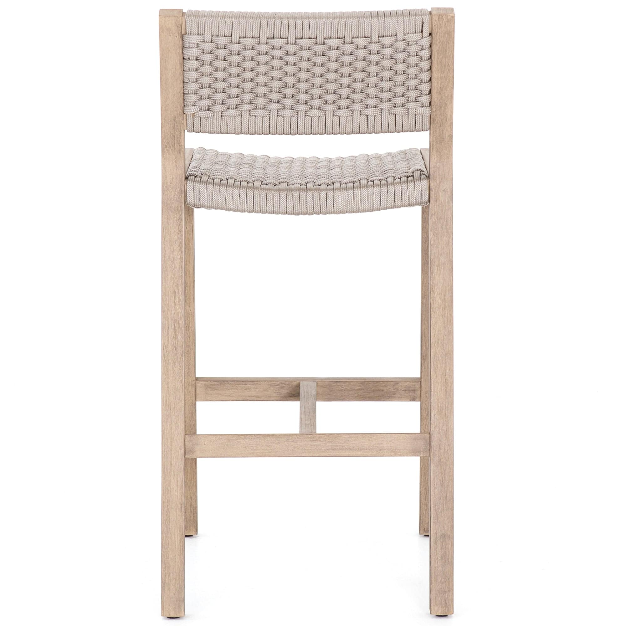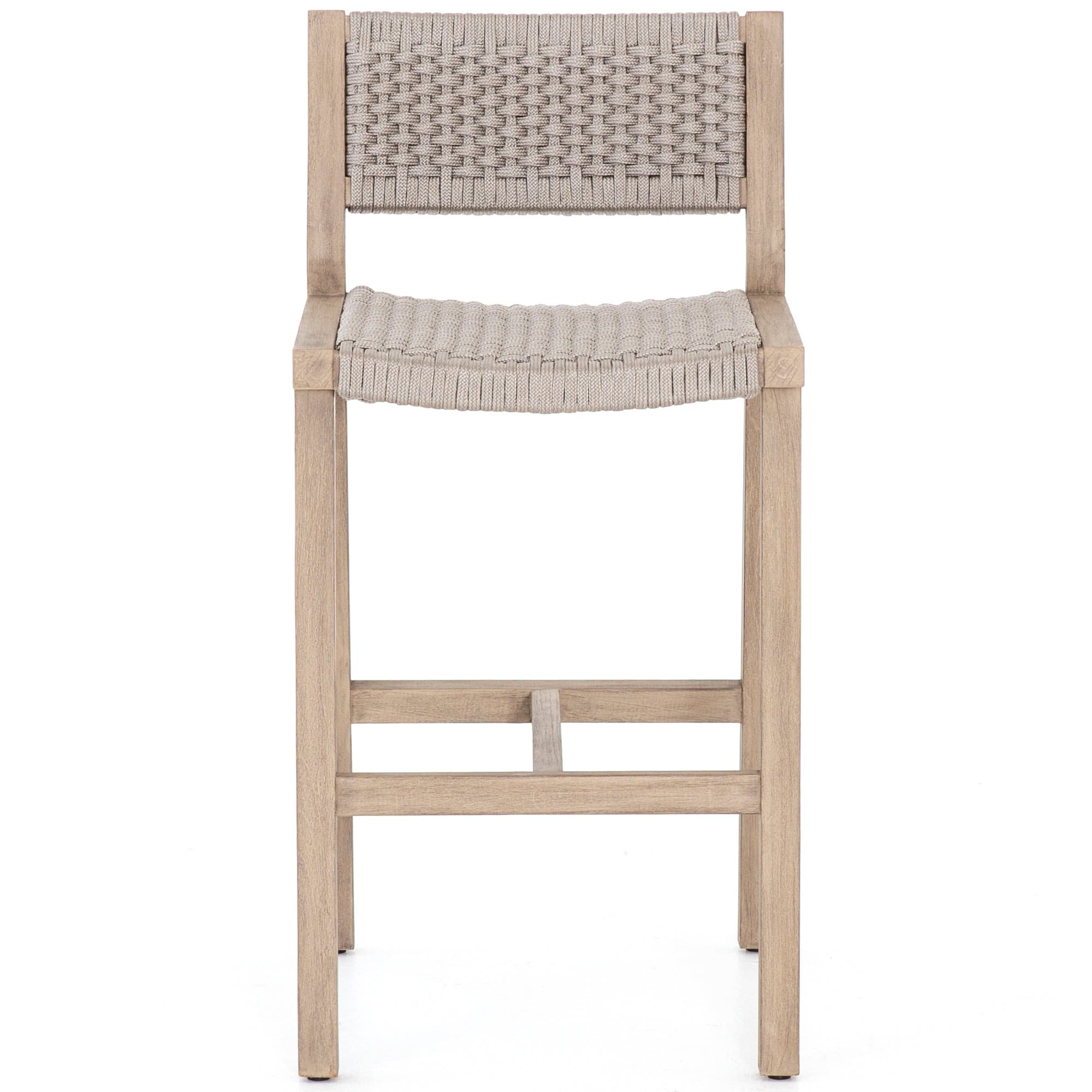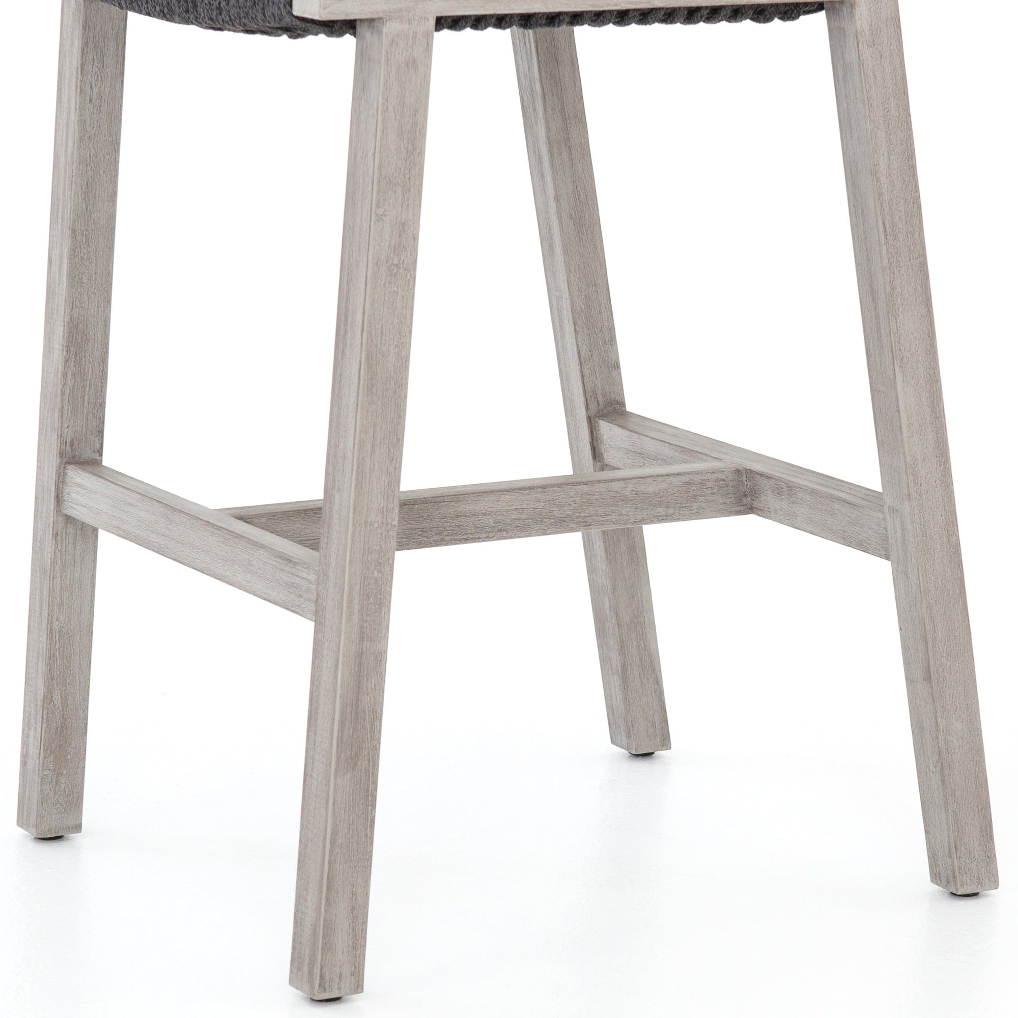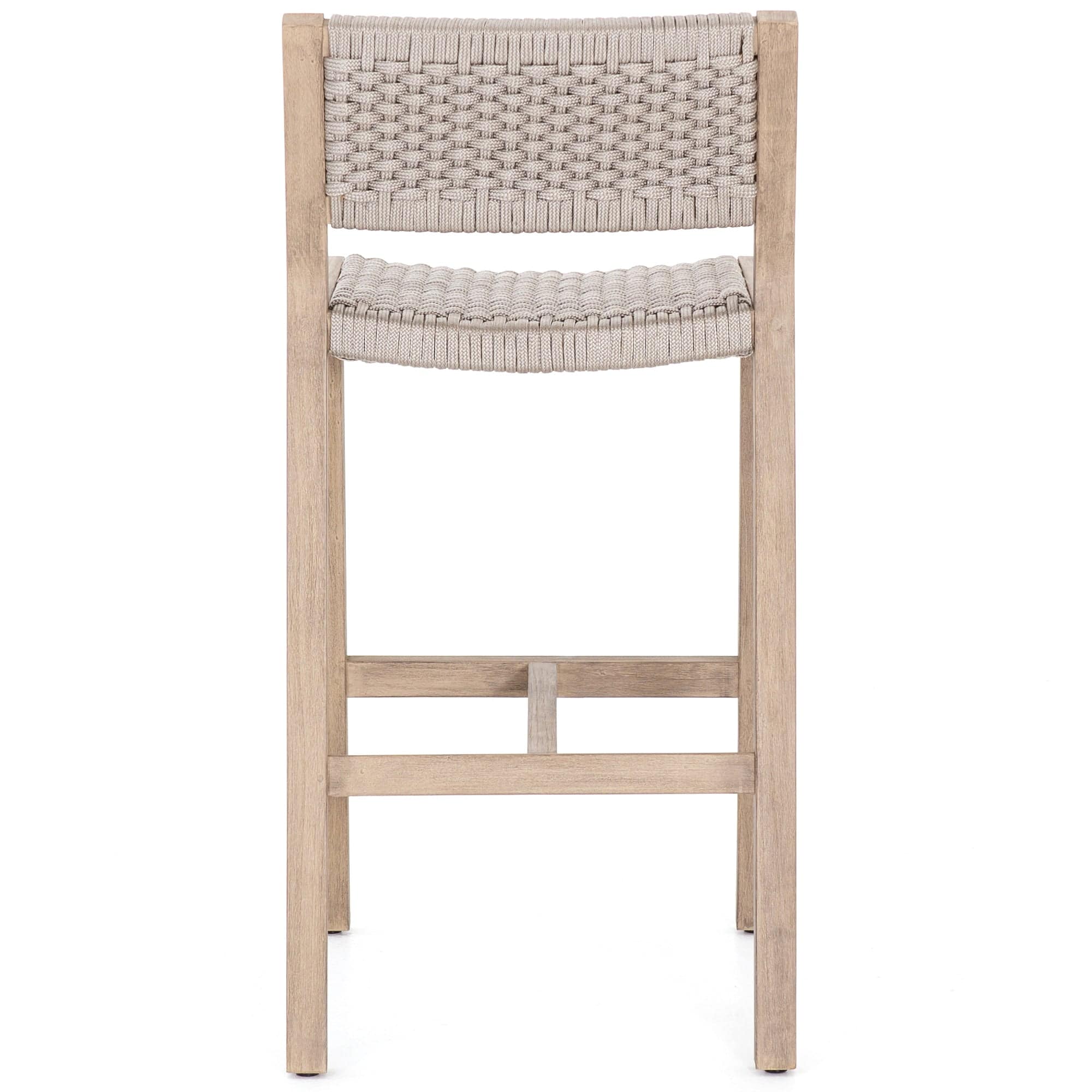 A textural take on outdoor bar styling, washed teak welcomes thick, handwoven rope seating in an inviting light grey. Safe for outdoor spaces. Cover or store indoors during inclement weather and when not in use.