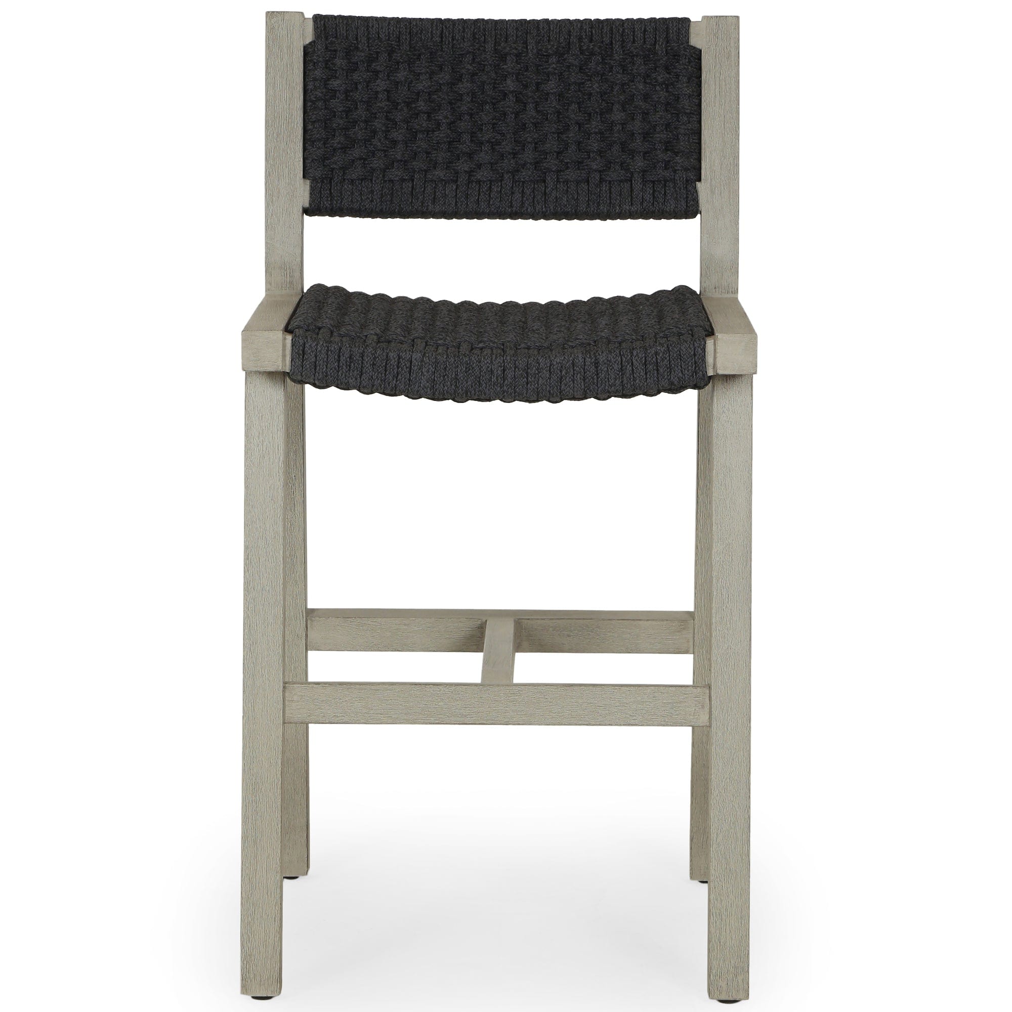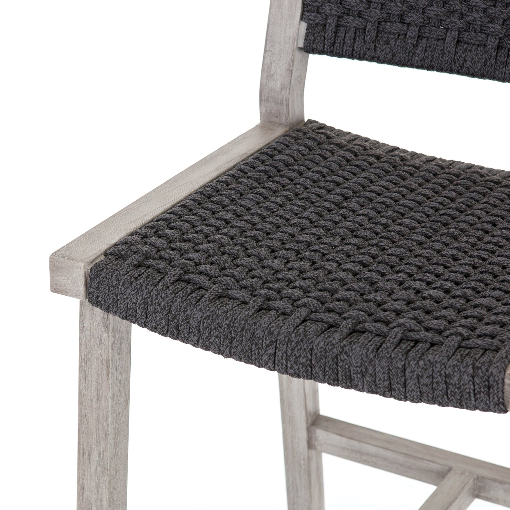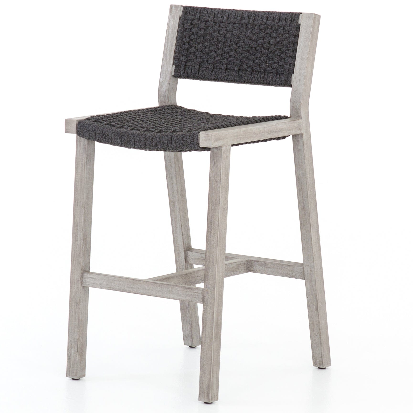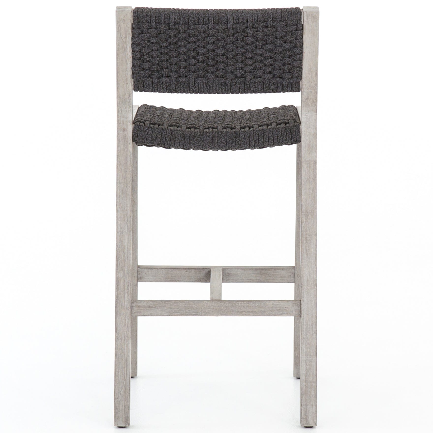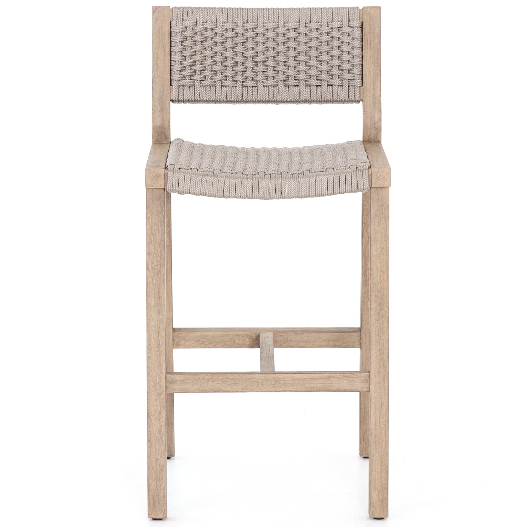 A textural take on outdoor bar styling, washed teak welcomes thick, handwoven rope seating in an inviting light grey. Safe for outdoor spaces. Cover or store indoors during inclement weather and when not in use.