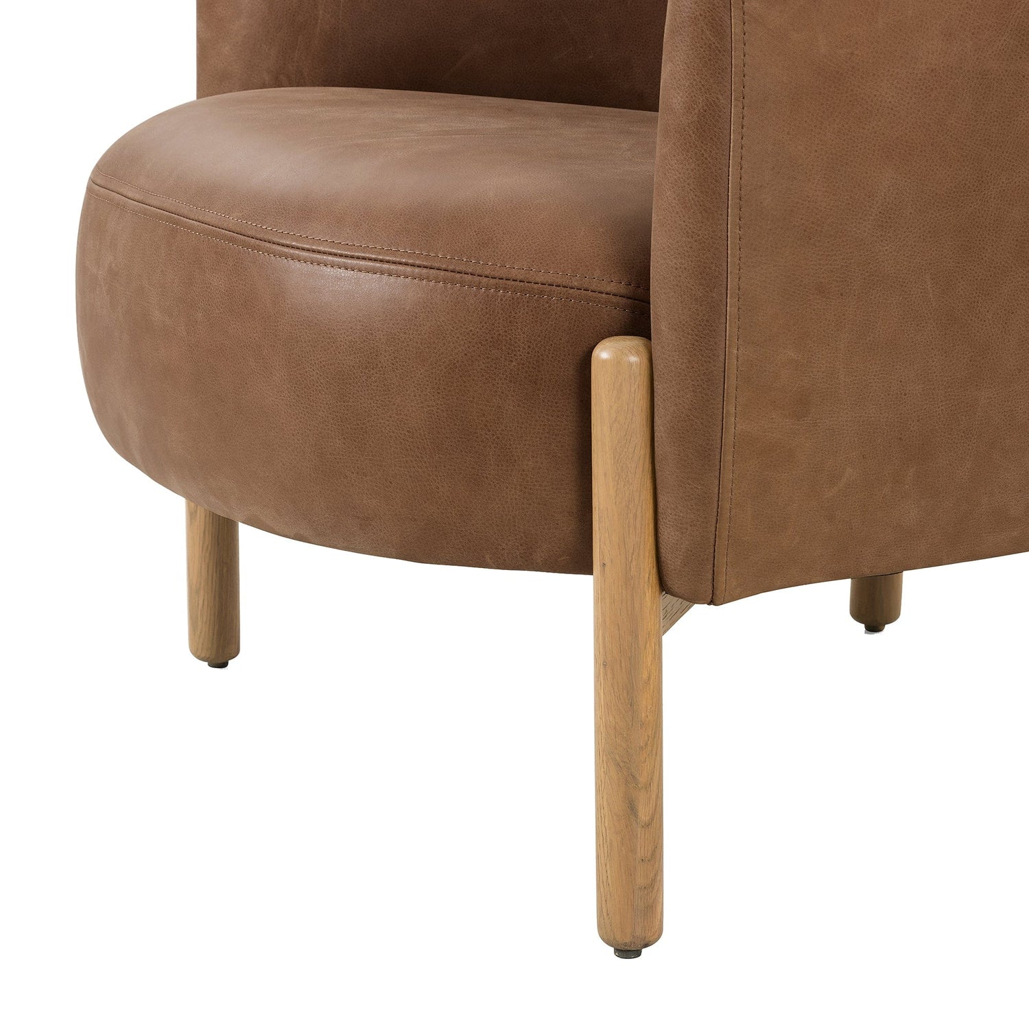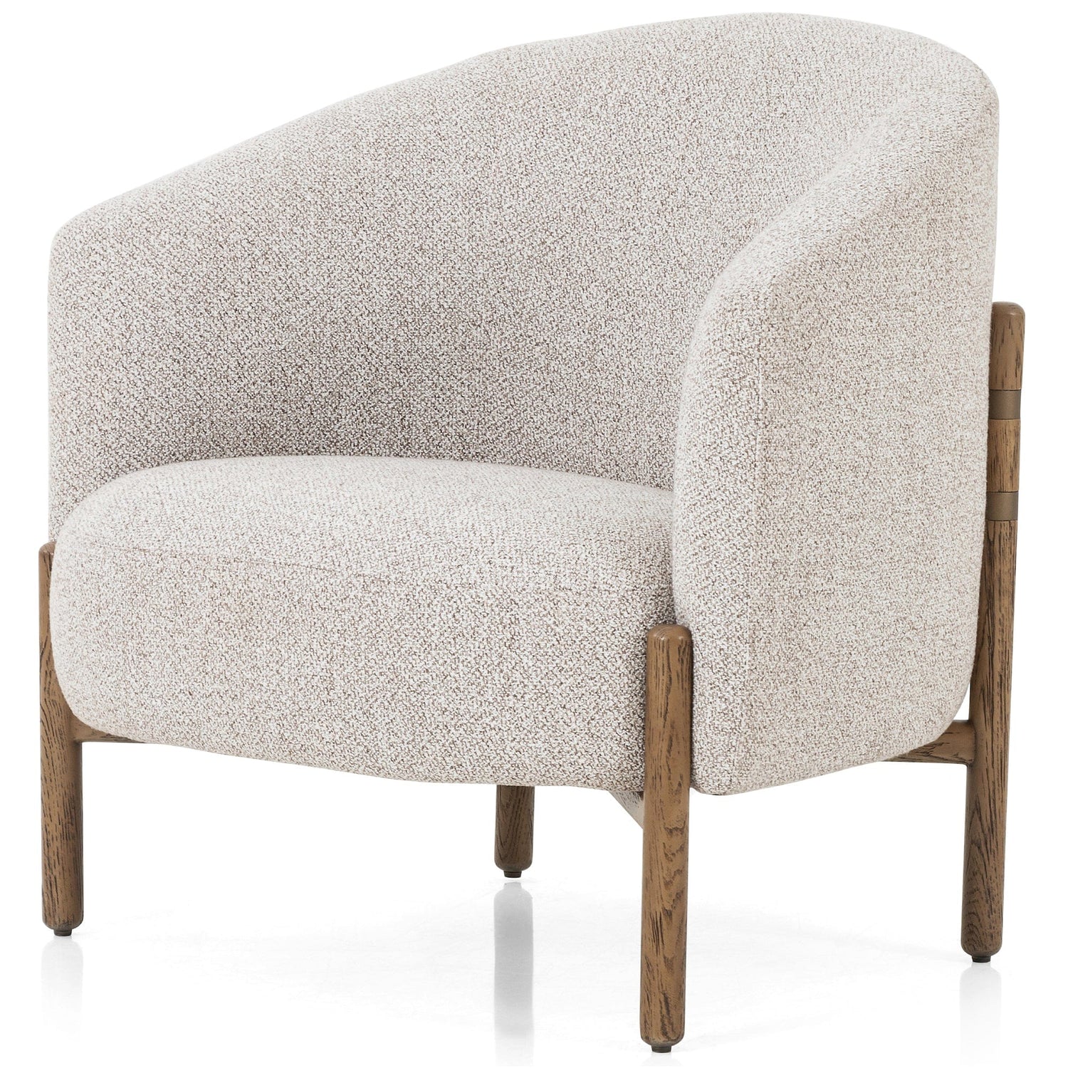 Sensibly elegant. Upholstered in light grey-colored performance fabric, traditional barrel back seating with a subtle wing silhouette cradles into solid oak framing, with rear iron stretchers adding a thoughtfully modern touch.