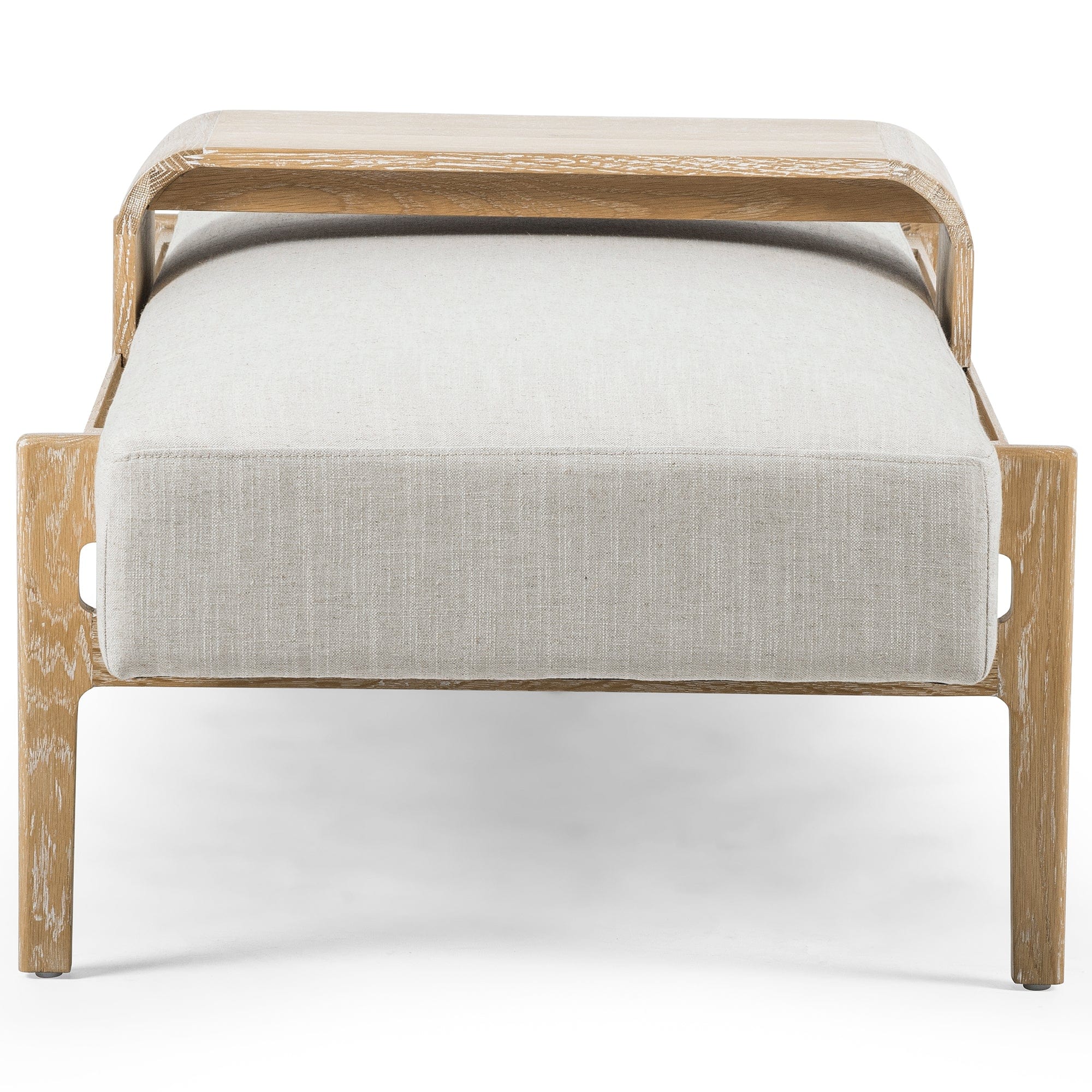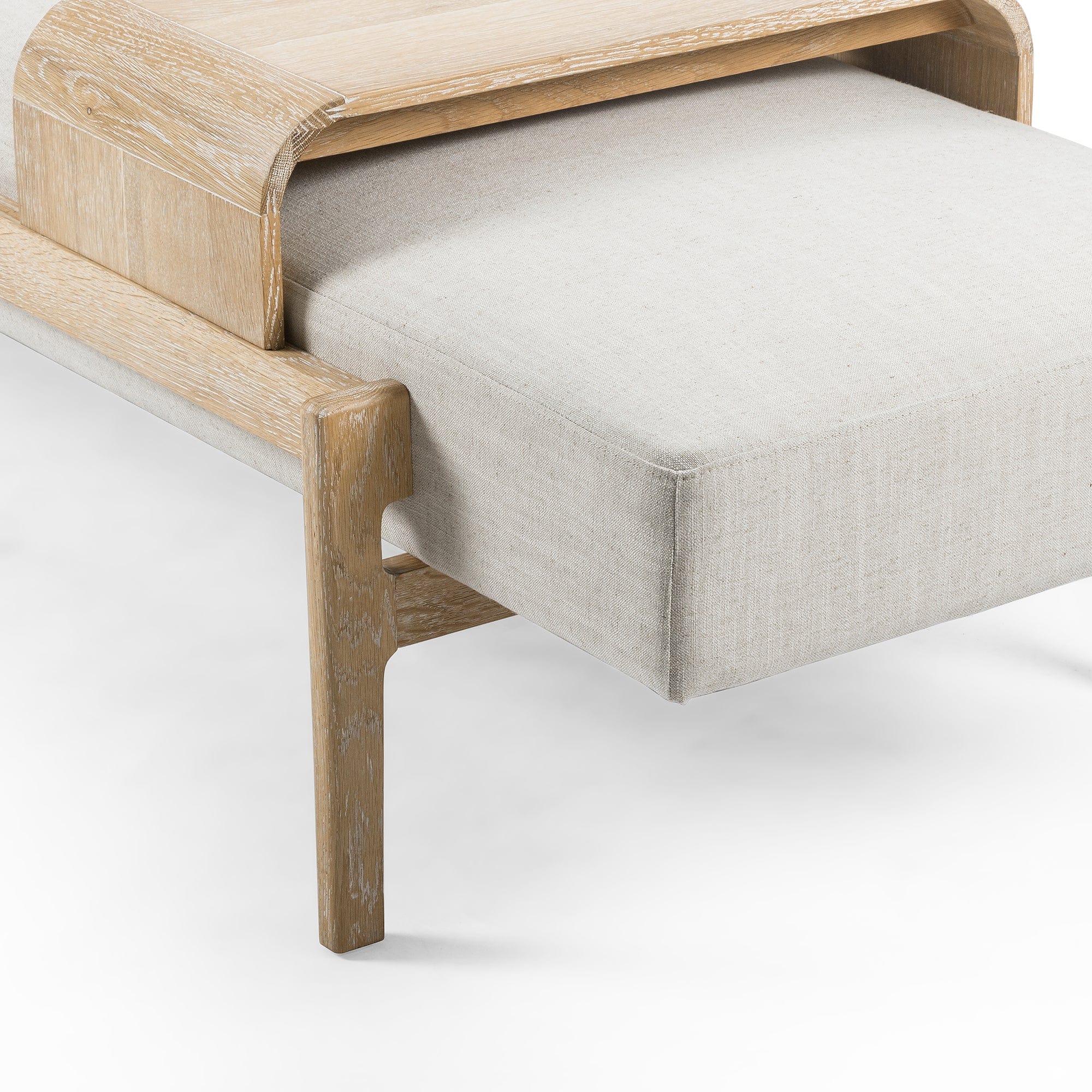 A uniquely modern statement piece inspired by the functional mid-century-style telephone bench, neutral poly/linen-blend seating features a sliding tray of white-washed oak – the perfect place for a favorite book or cocktail. Great in the entryway or living room.