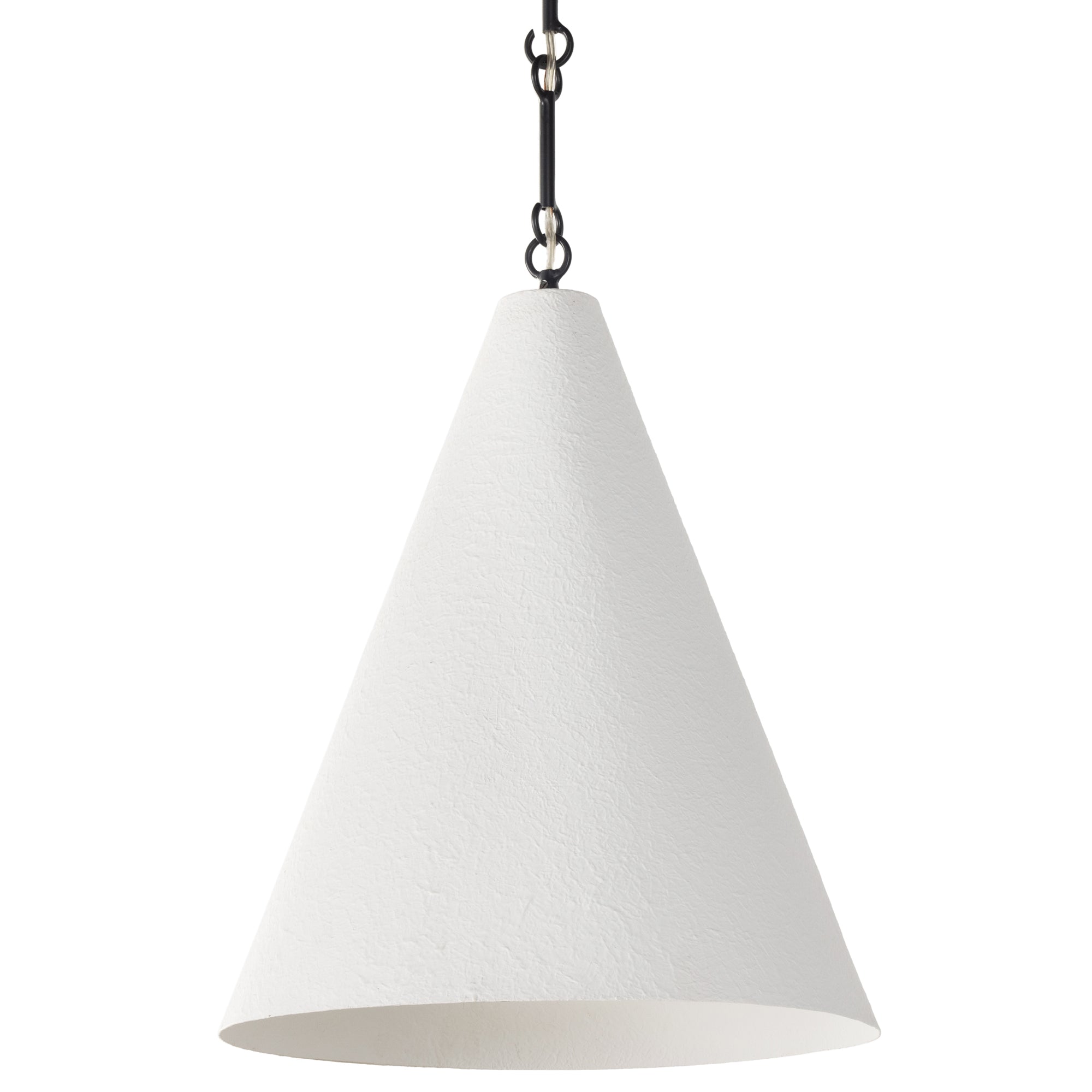 Simple and modern, this textured grand-scale pendant has a hand-molded look. Cast aluminum in a crisp matte white plaster finish is complemented with antiqued iron hardware and a jewelry-inspired chain.