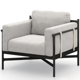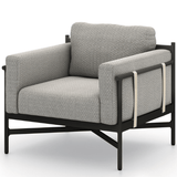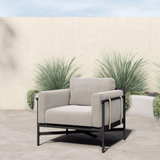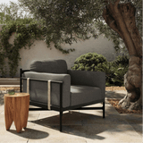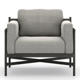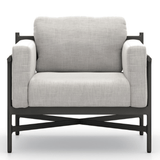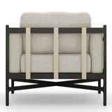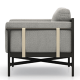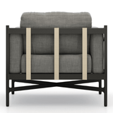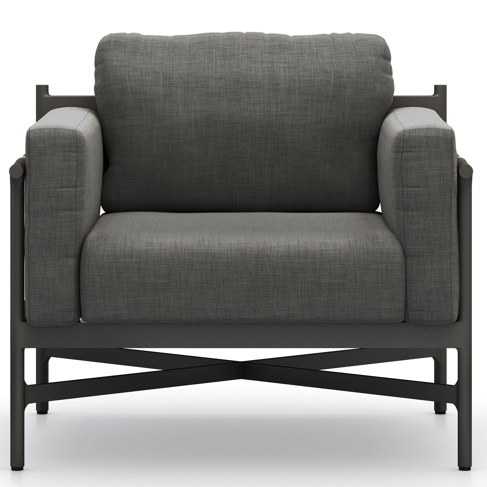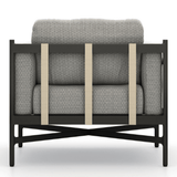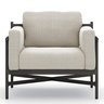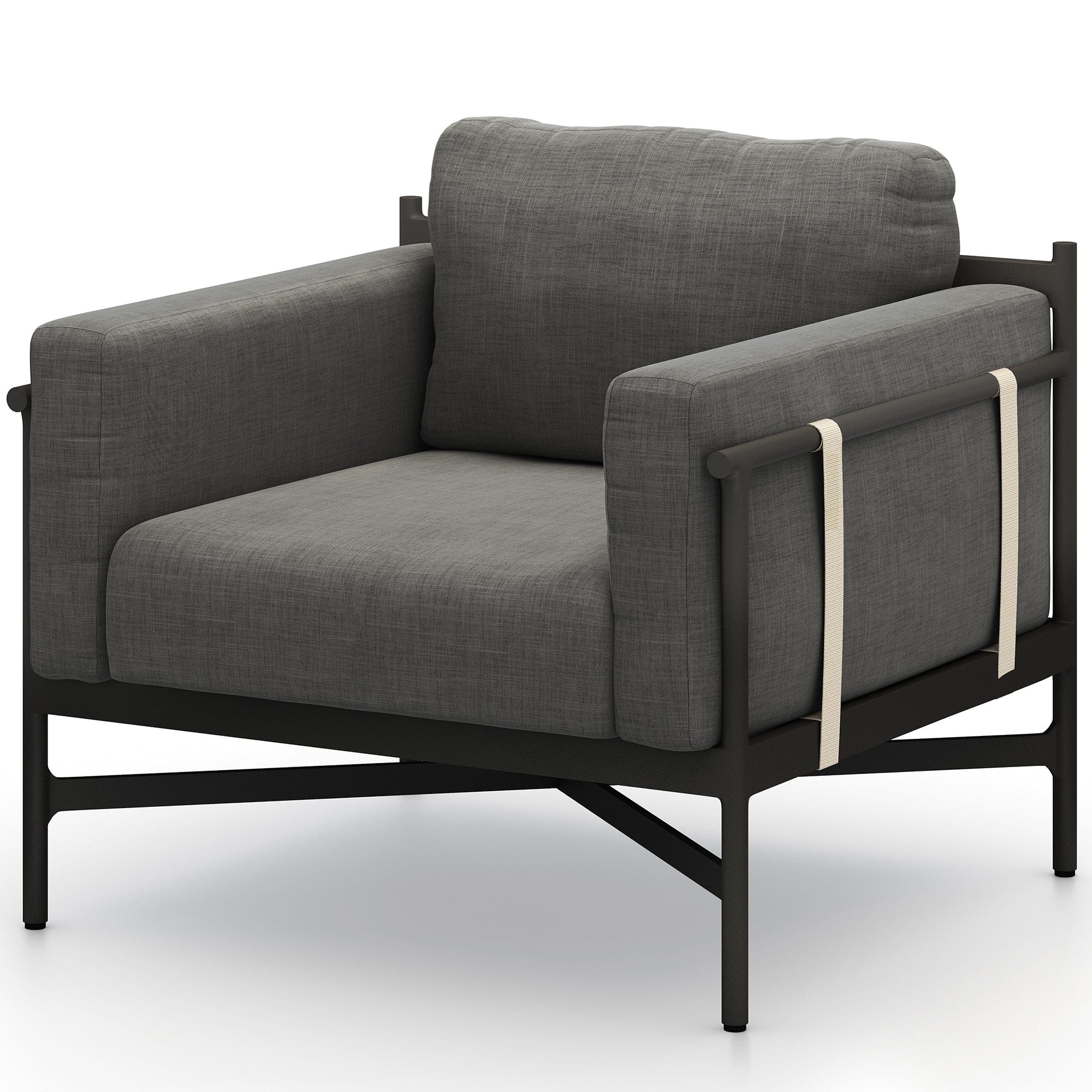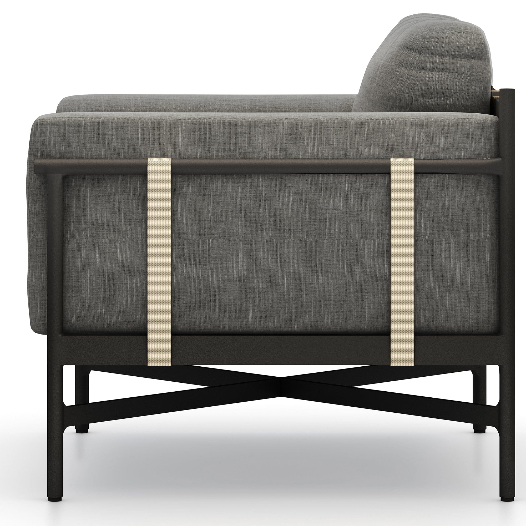 Play up proportions. Dark bronze-finished aluminum provides an airy frame for lushly comfortable seating. Ivory strapping adds a detail-driven finishing touch. Cover or store indoors during inclement weather and when not in use.
