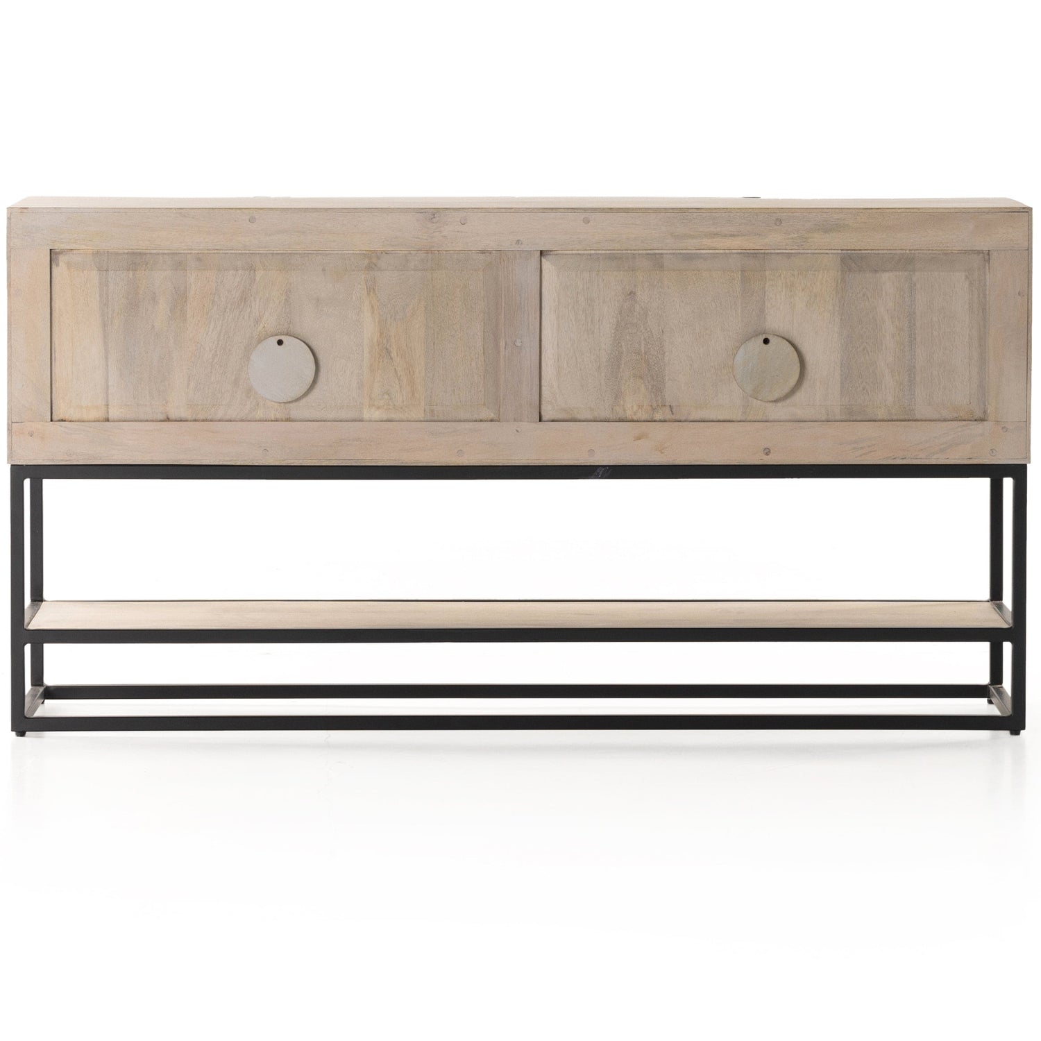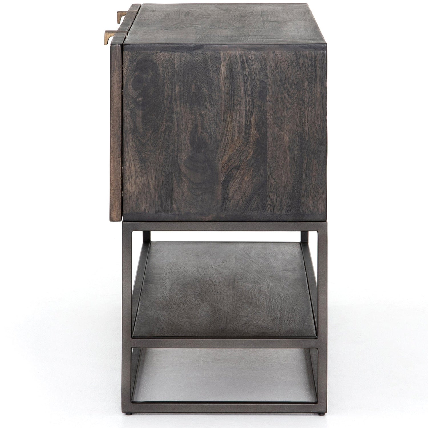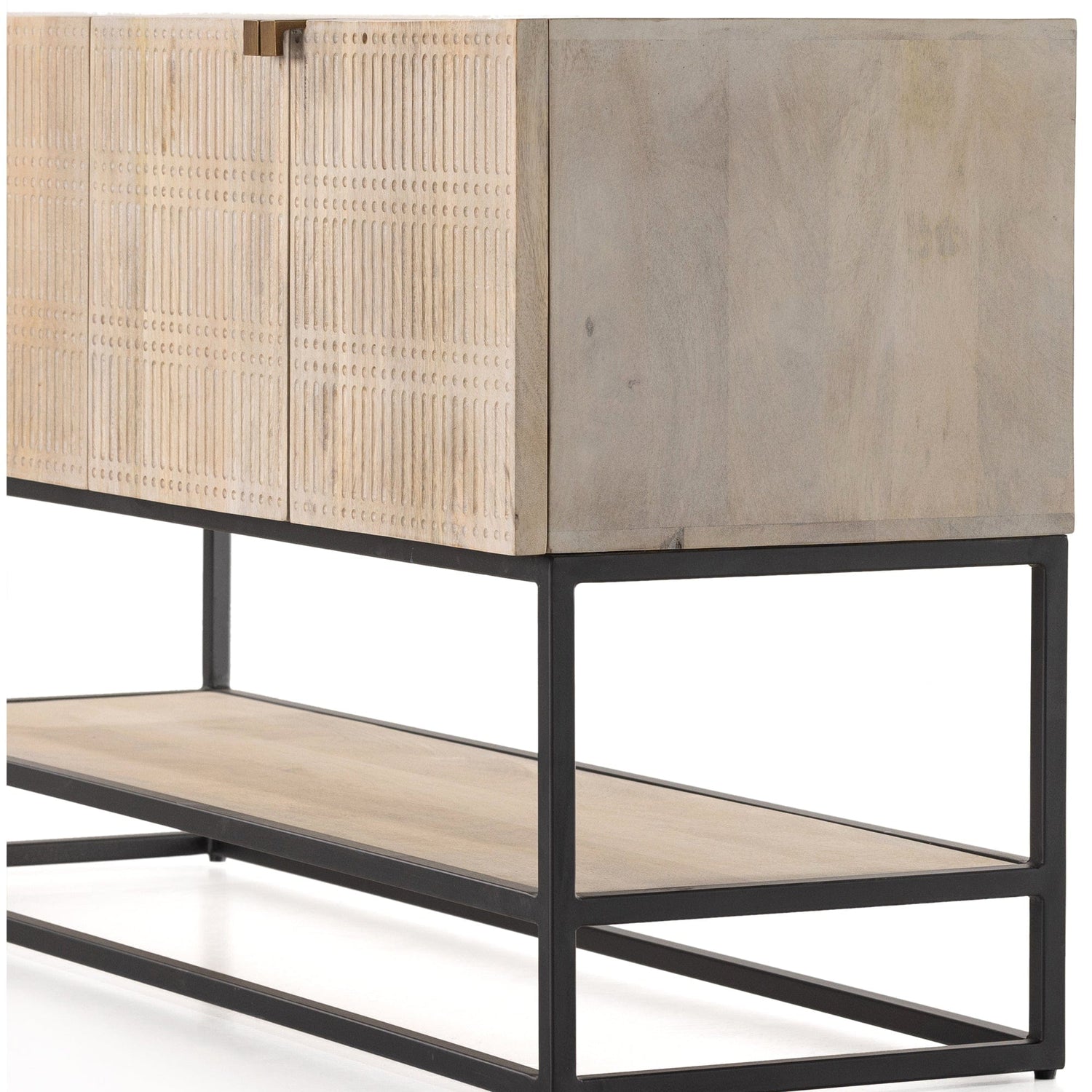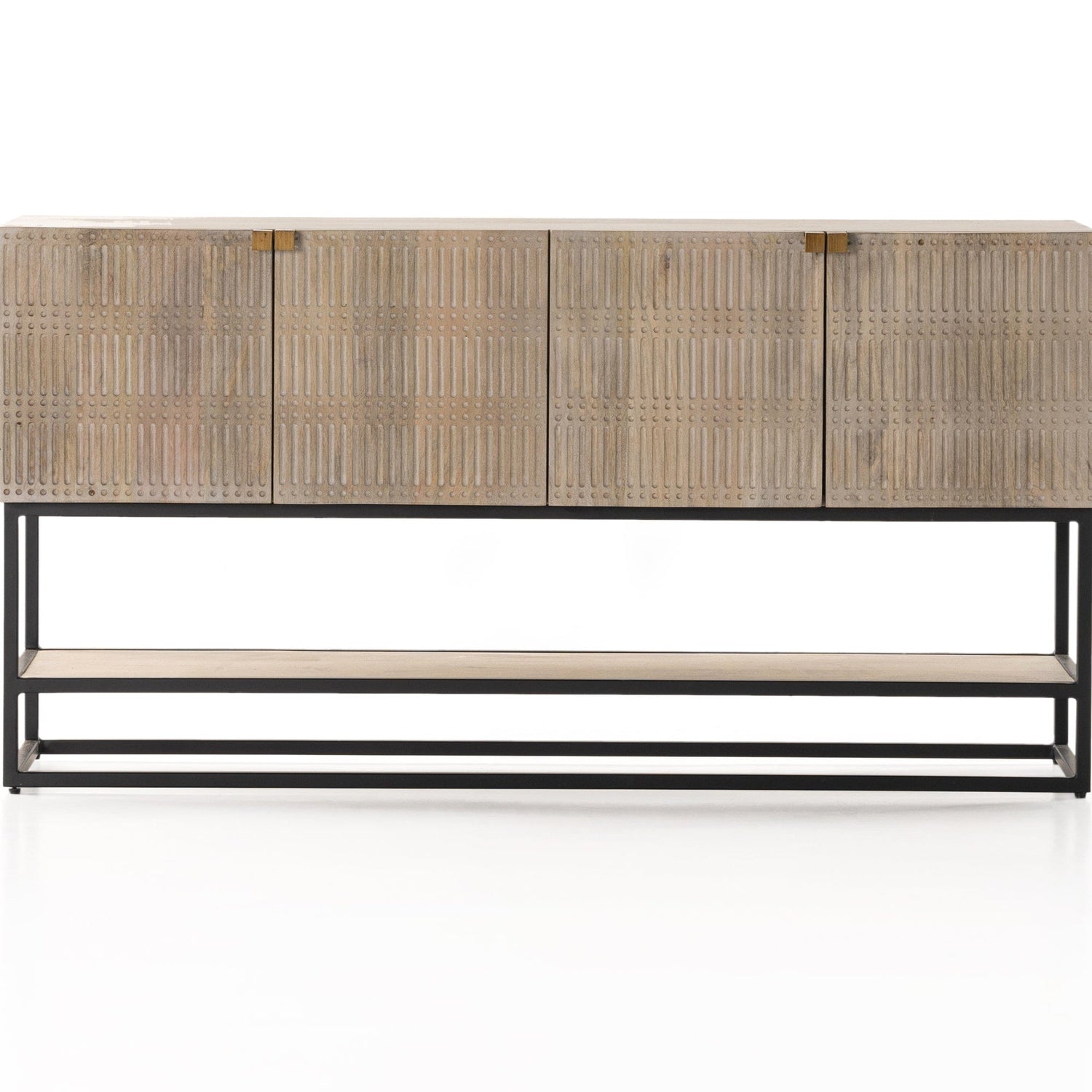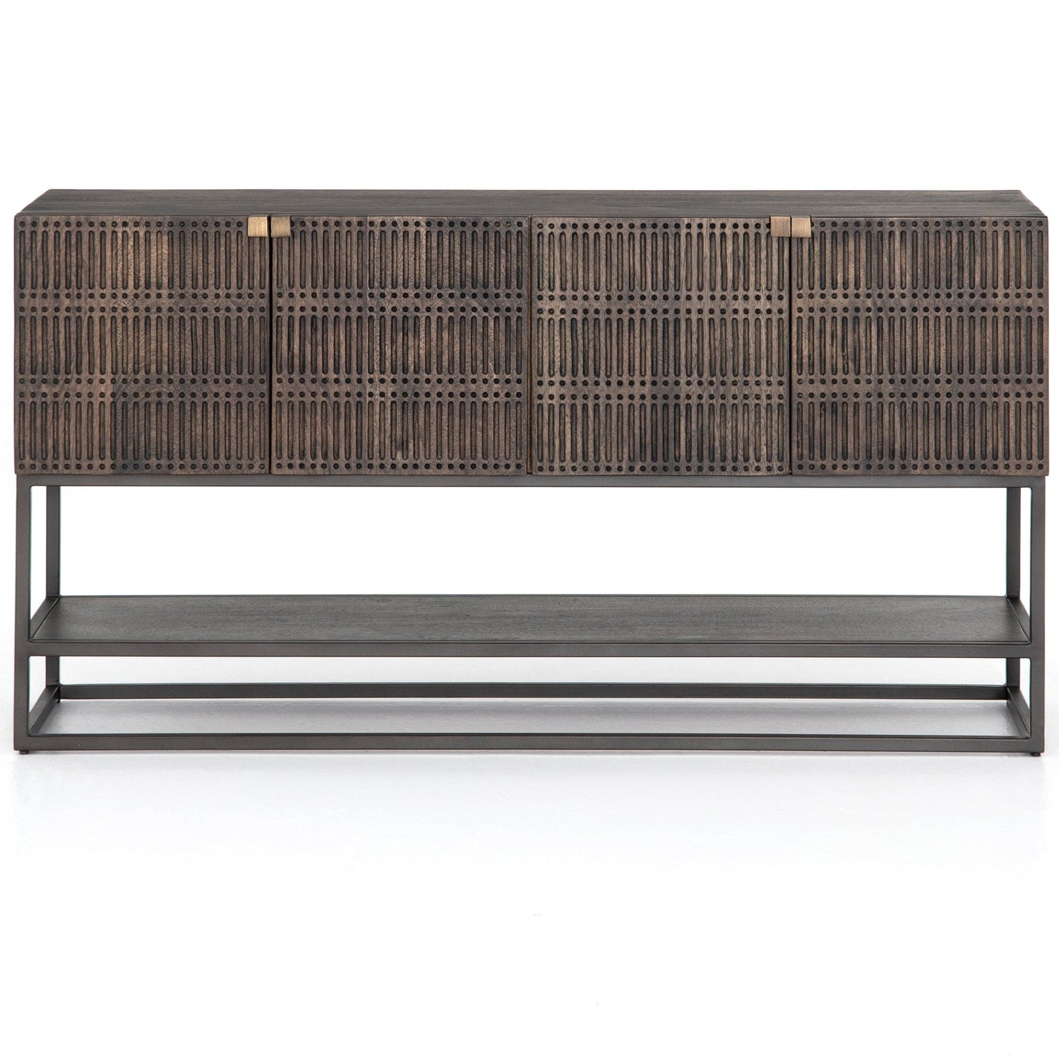 Unique linear carving meets new dimension with an artisan slant. Mango wood casing is finished in a vintage brown, highlighting texture and craftsmanship. A slim iron base adds an airy, cage-like look to small-scale media storage. Rear cutouts for cord management.