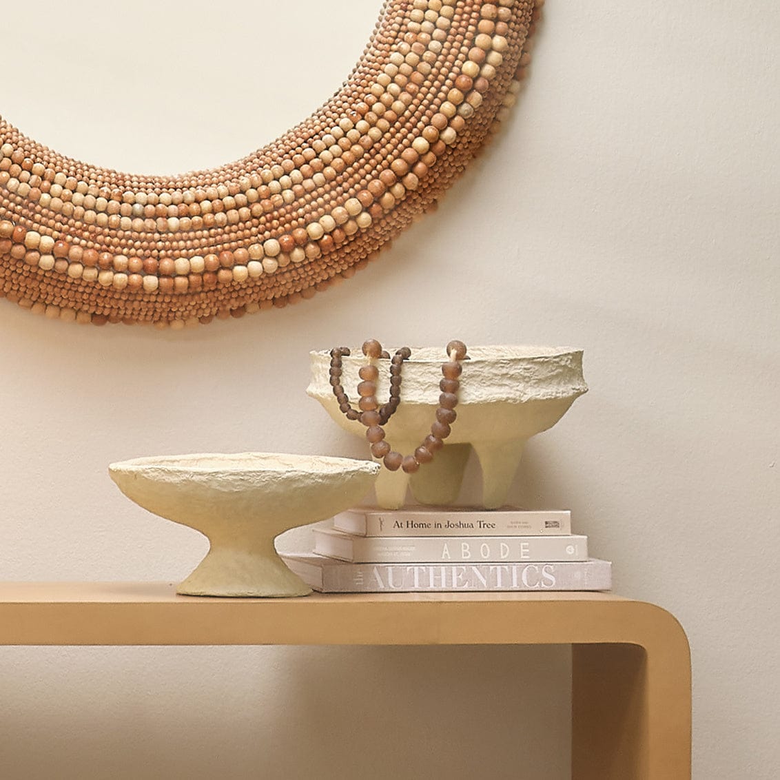A traditional craft in the East since ancient times, the distinctly organic characteristics of papier mâché objects make them an enduring and timeless home décor element. These cotton mâché bowls are a riot of texture and dimensionality. They can be filled; try glass deco balls for refinement, or seed pods to continue the organic motif. With their soft, dusty cream palette, these one-of-a-kind artisan crafted pieces are stunning alone or as part of a coordinated display. For decorative use only.
