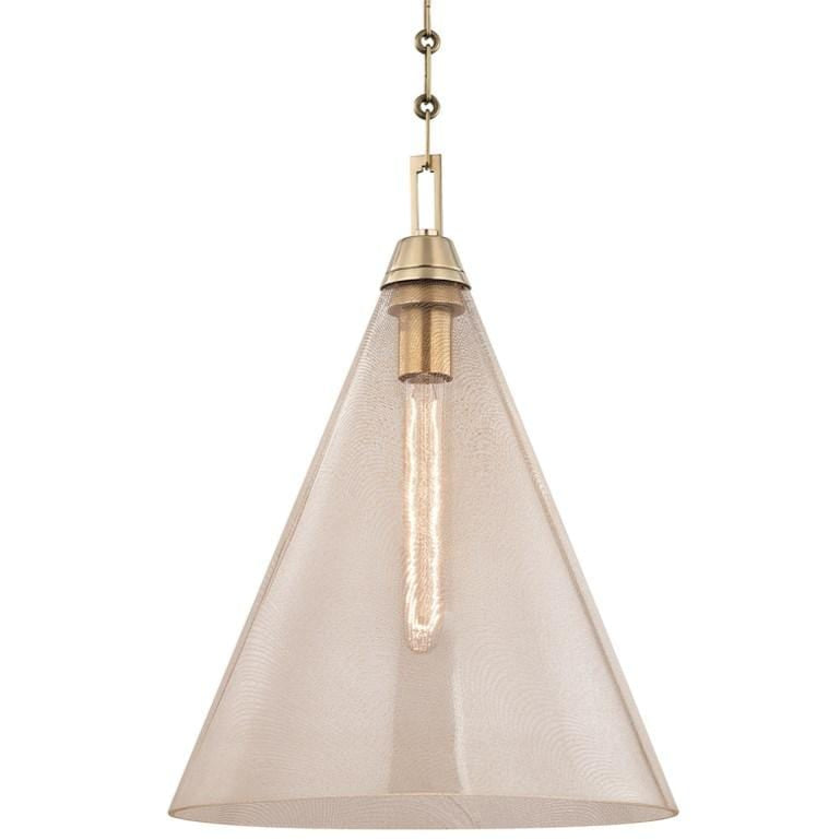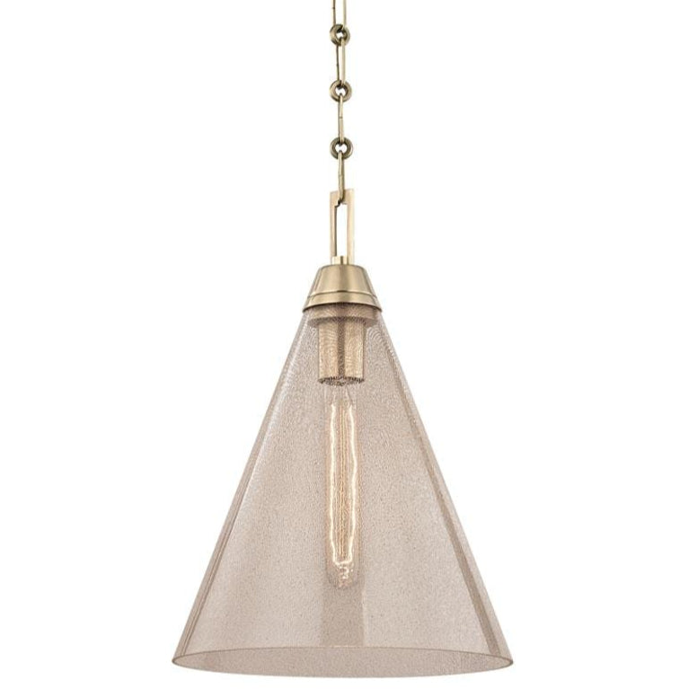 This stunning piece is a minimalist work of art; using a unique European technique, artisans inlay strands of brass to the molten glass while blowing it into a cone. This brass remains encapsulated there, coming to life when illuminated from within and resulting in a work of simple sophistication. Housing a long, tungsten-filament bulb, each piece gives forth its own character.