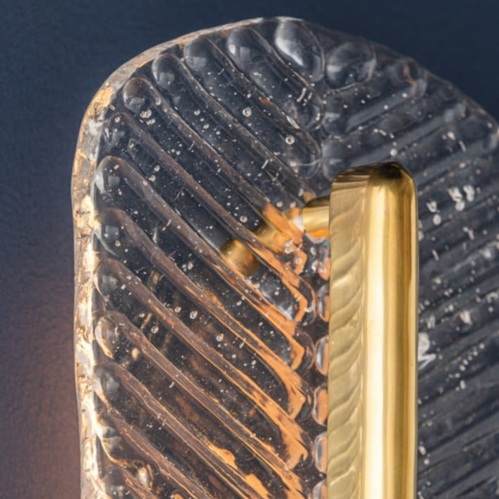 A delicate and slender hand-blown piece of Piastra glass is mounted on an Aged Brass stem, creating the focal point of this botanical-inspired sconce. Resembling a leaf, the glass has been crafted with grooves that replicate the natural texture and variation of leaves. Concealing an LED, this sconce gently diffuses light over small areas.