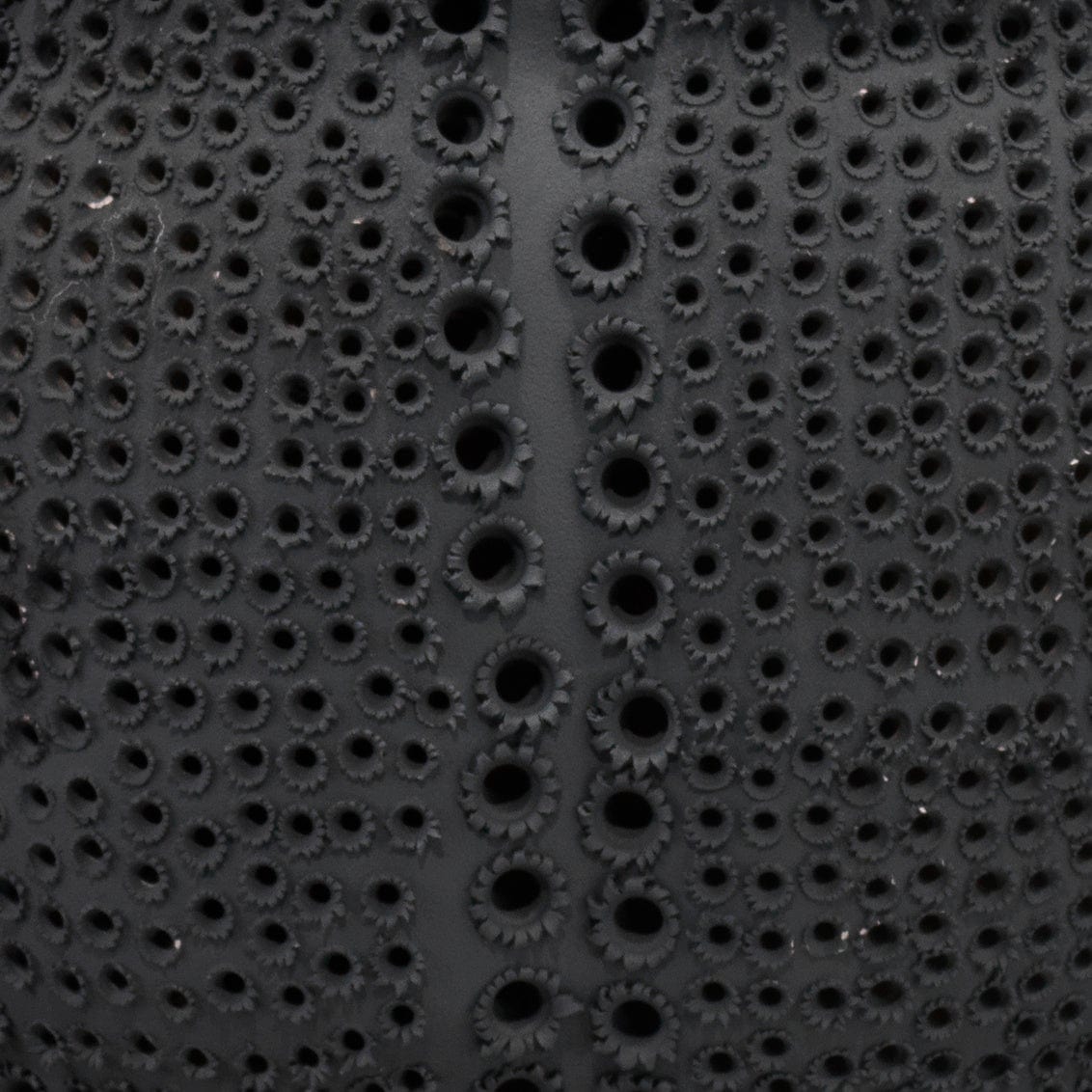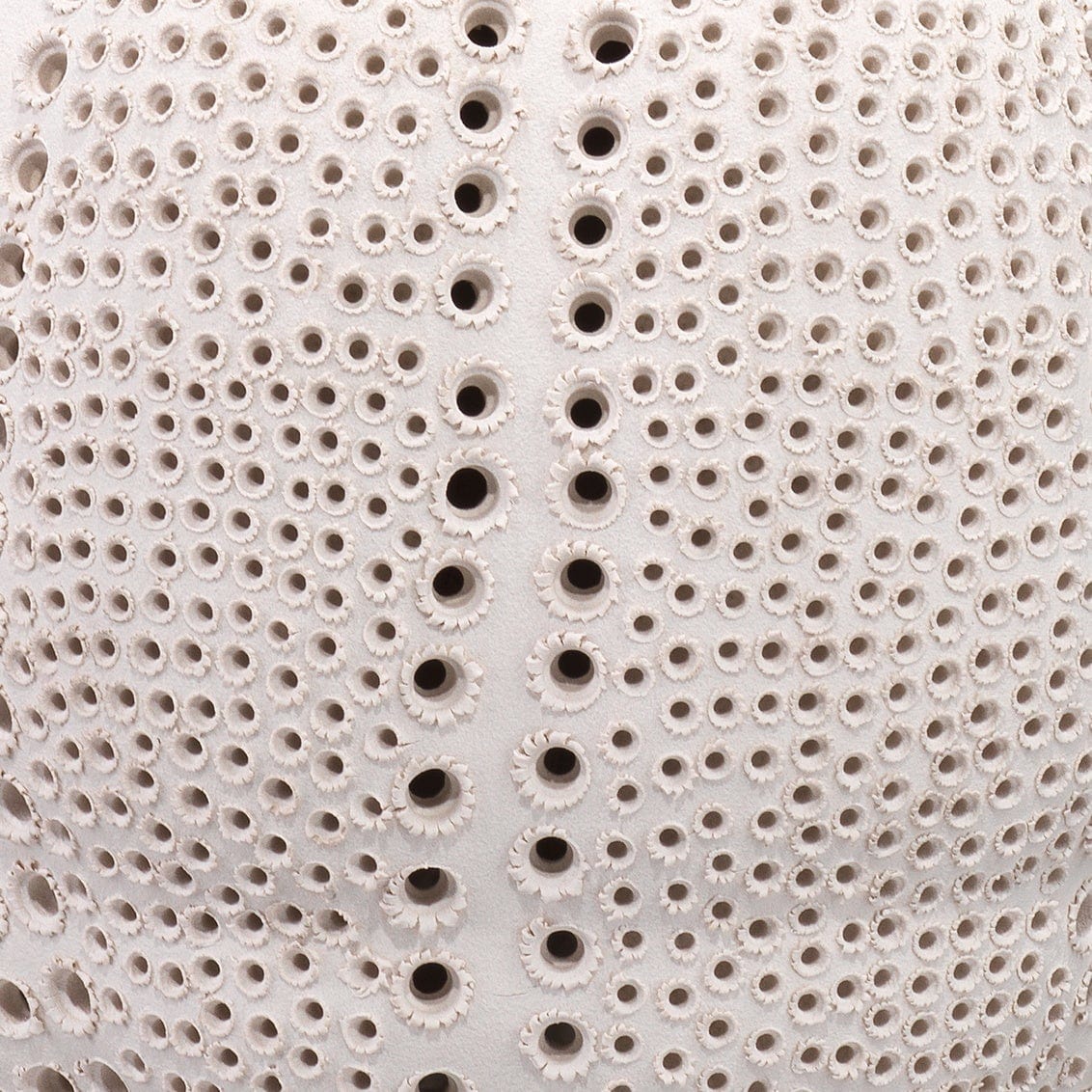 The perforated patterns on the curved and dimpled base of this table lamp reflect Jaime’s interpretation of the craters, mountains, and seas of the lunar landscape. While the design’s celestial inspirations are subtle, the look is not! The bold and decorative patterns are created one-at-a-time by talented artisans. Each lamp is topped with a linen rolled-edge drum shade in white and an acrylic ball finial; the sockets and 3-way turn knobs are silver. The Lunar lamp is available in your choice of Matte Black or Matte White. No two will be identical.