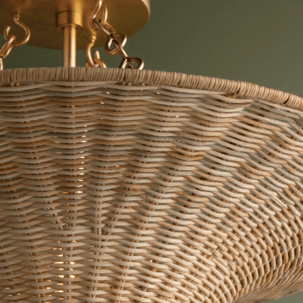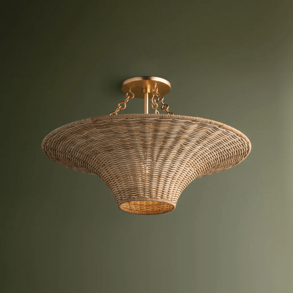 Hand-woven from natural wicker, Ketan puts a playful spin on a design inspired by Charlotte Perriand. The inverted trumpet shape of this semi-flush emits both up and downlighting, with the exposed bulb casting a powerful beam. Completing the fixture's fresh appearance is a simple chain and canopy cast in Vintage Gold Leaf.