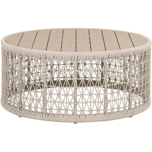 The Knit Outdoor Round Coffee Table by Essentials For Living elevates outdoor spaces with its coastal style and robust construction. Crafted with a solid teak wood top in a washed ever teak finish, it features a multi-step hand-applied polyurethane coating for lasting resistance to the elements. The base is made of aluminum covered with a polyolefin oat flat rope hand-woven in a knotted design. Adjustable feet levelers ensure stability, making this round table a refined and versatile addition to any patio or garden setting.