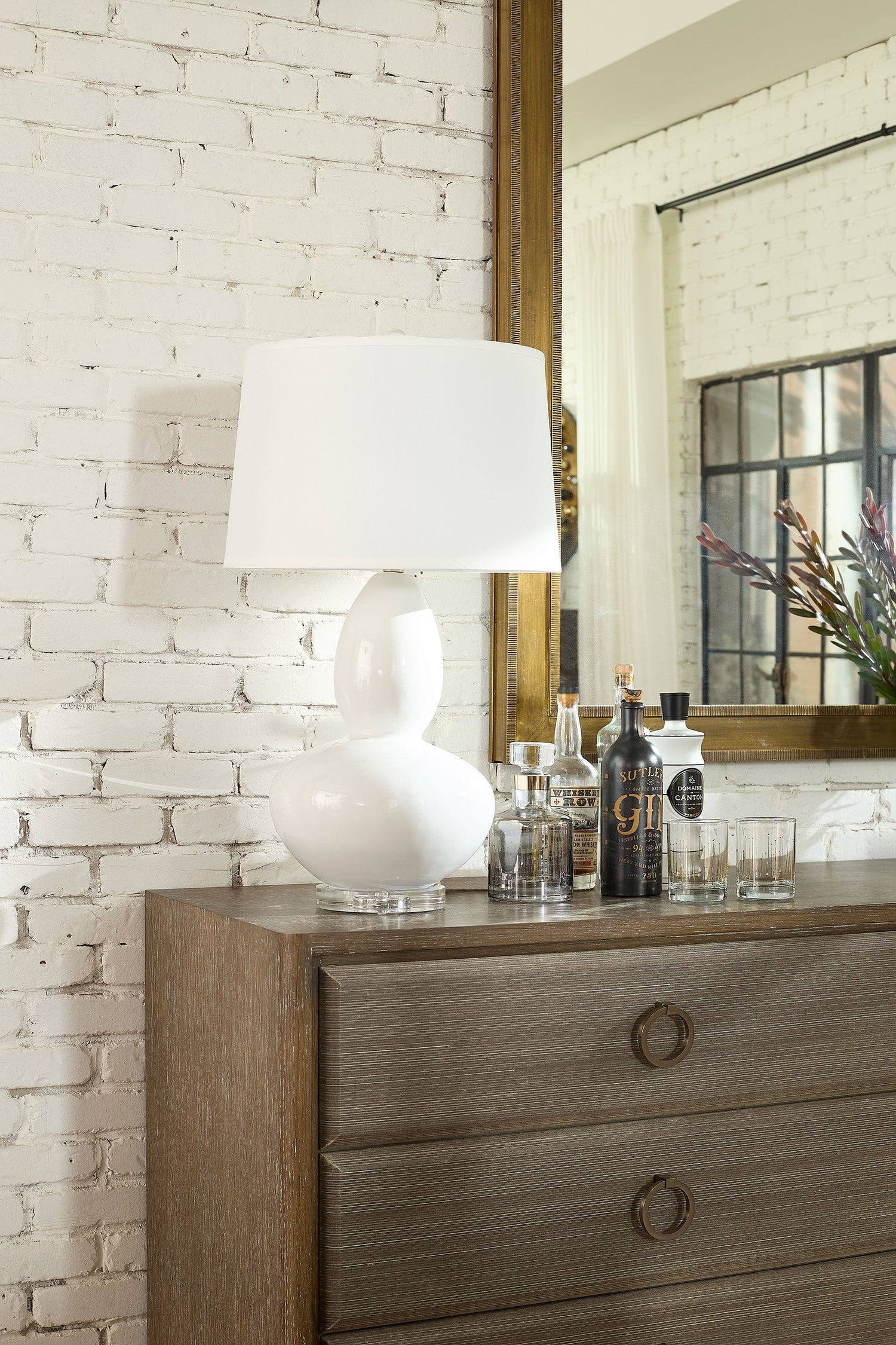 The Lisbon Lamp features a contemporary double-gourd silhouette with an oblong top, offering a fresh take on a classic form. Its ceramic body is coated in a thick, lustrous glaze, adding richness and depth to its modern design. Resting on a clear acrylic base and topped with a matching acrylic ball finial, this lamp seamlessly blends sophistication and style. Complete with a nickel harp, the Lisbon makes a cool addition to any interior.