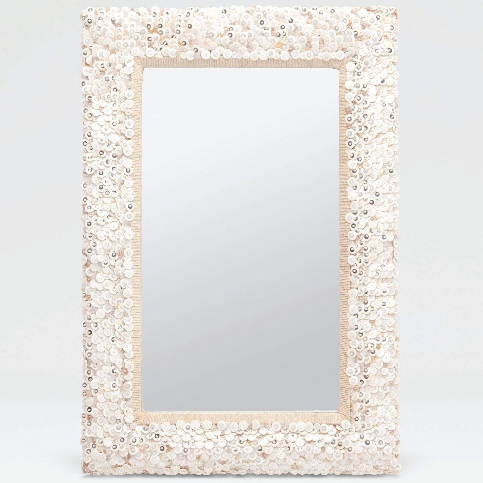Who knew beige could be so feminine! The Abigail is covered with small shell disks in various sizes. Each one is individually attached with a small river pearl button and a sequin. A woven natural fiber inner frame finishes the piece.