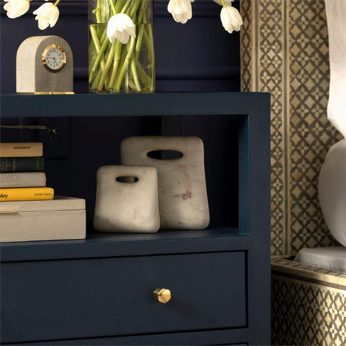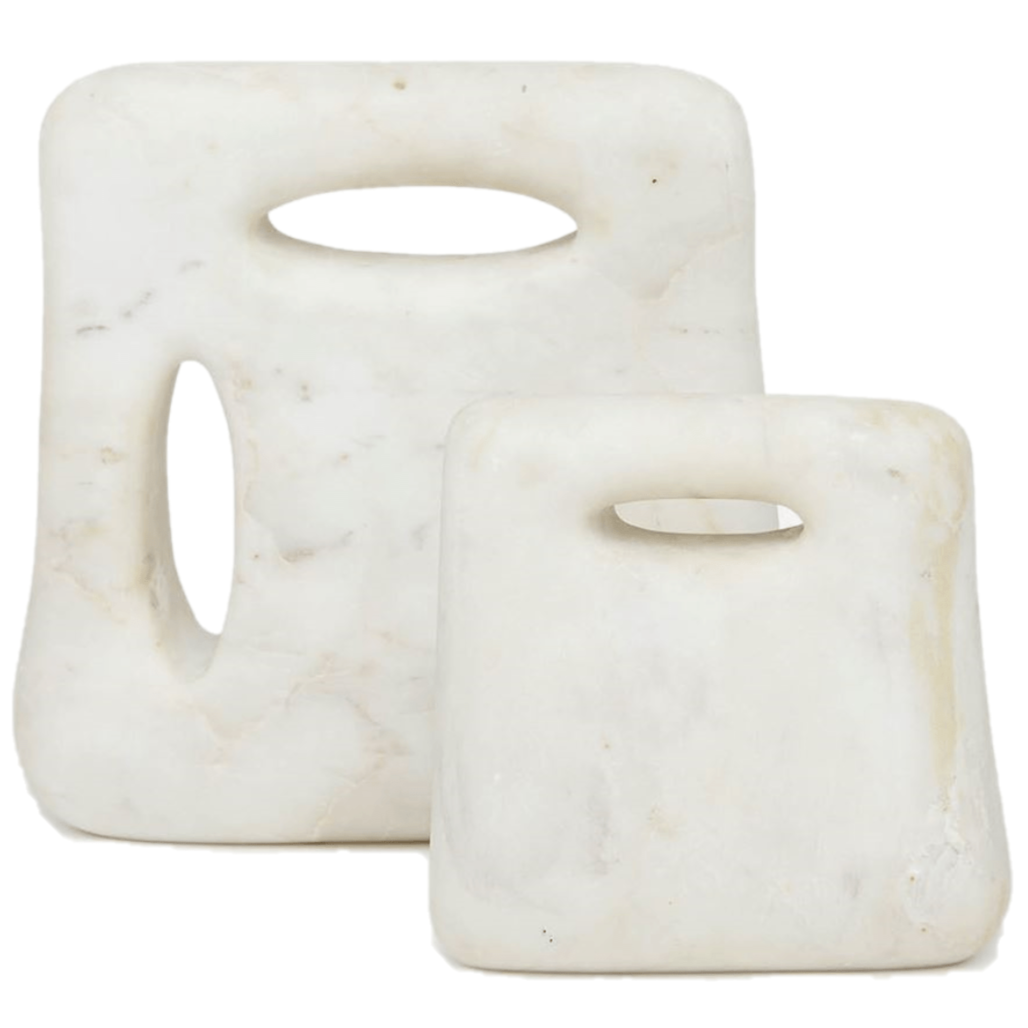 Set of 2 square white marble sculptures with rounded corners and oval cutouts.