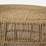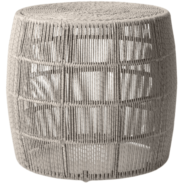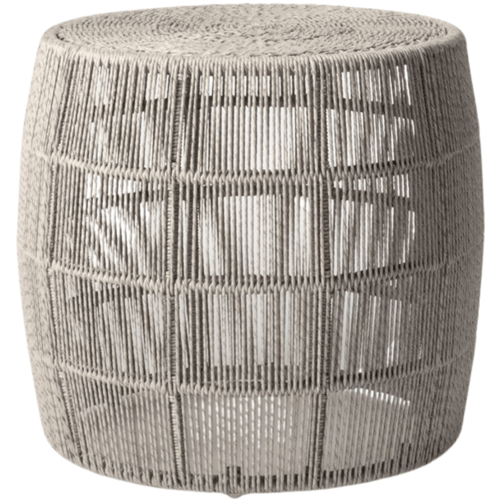 This light, airy outdoor side table is crafted from spokes of twisted faux wicker, woven over a simple barrel frame with a subtle underlying grid pattern.