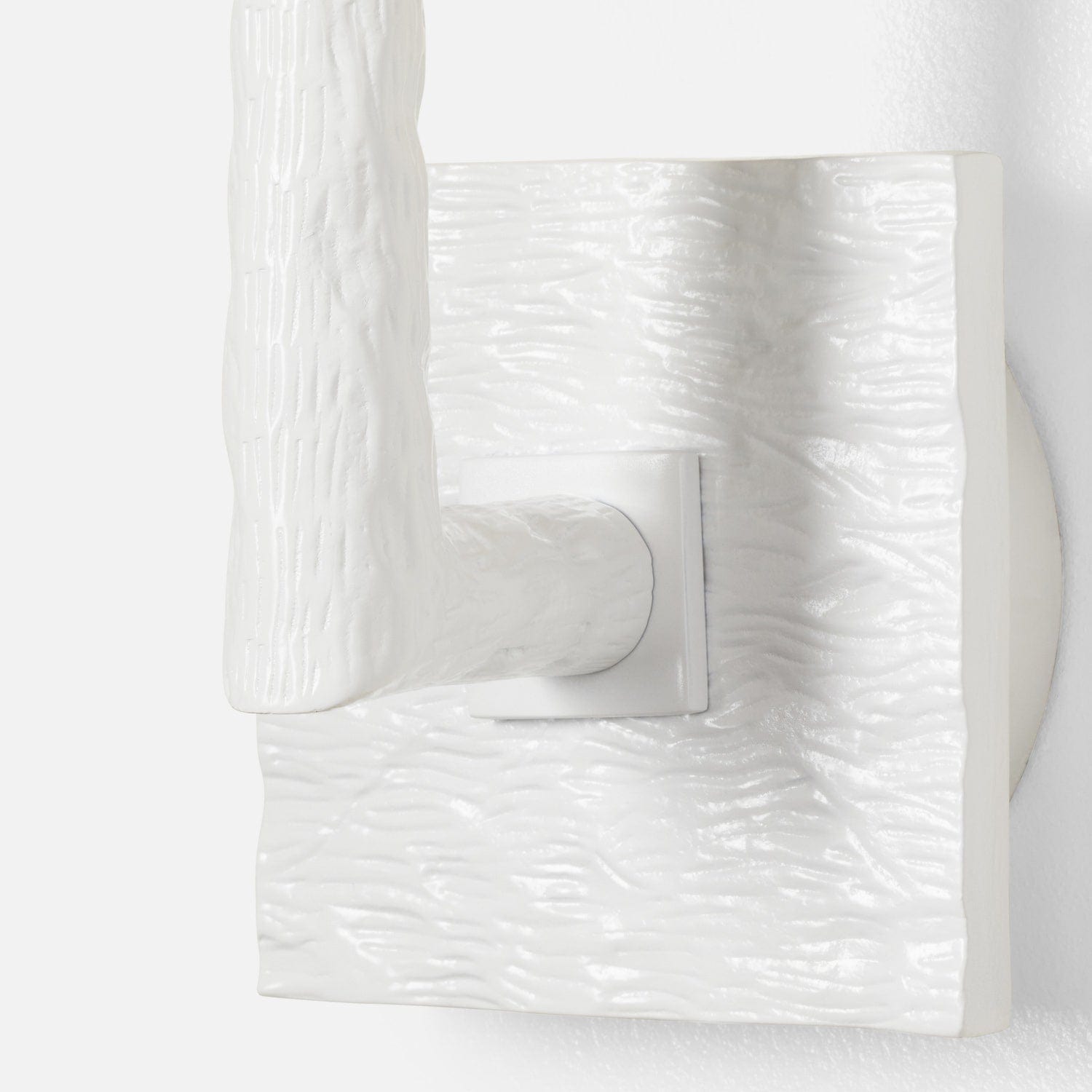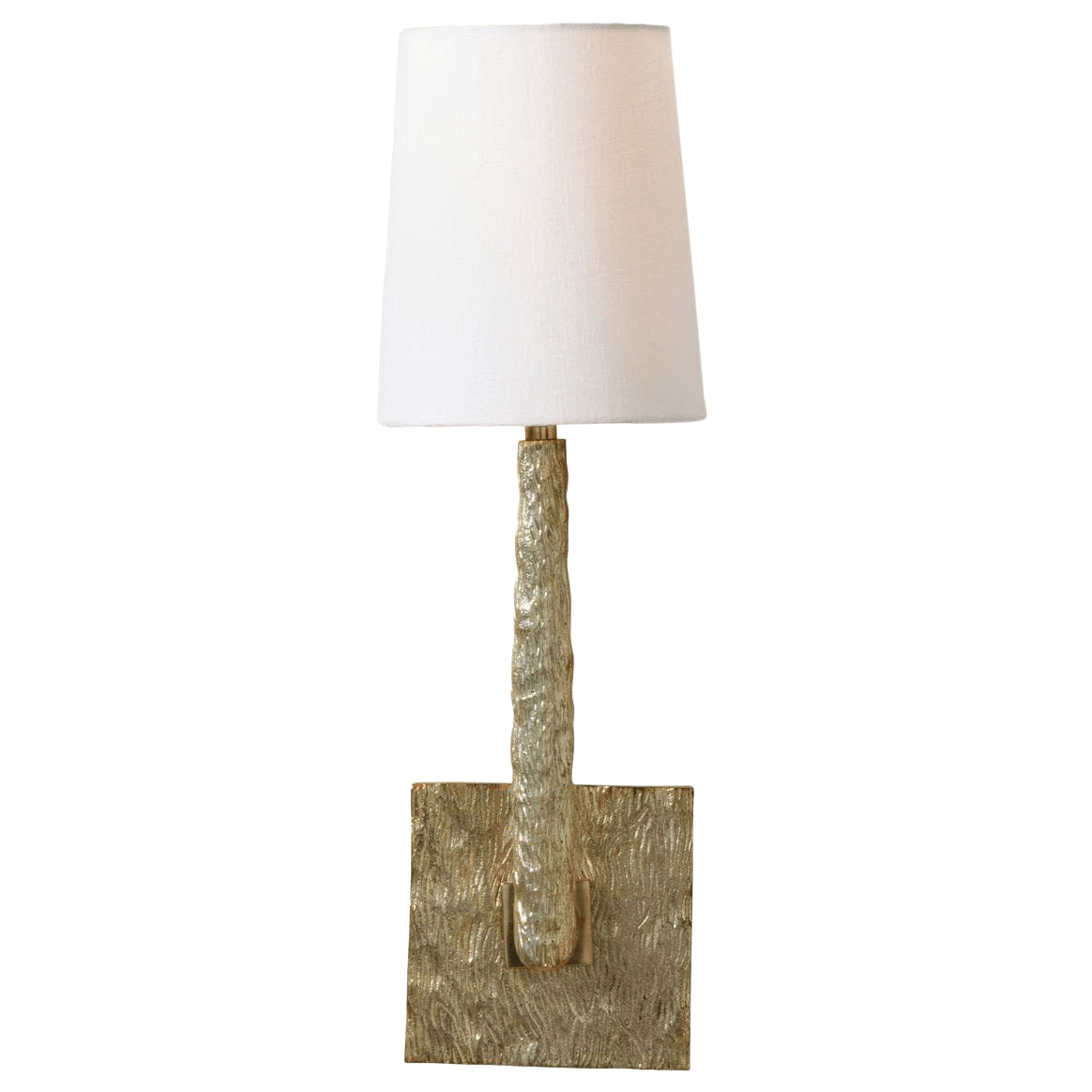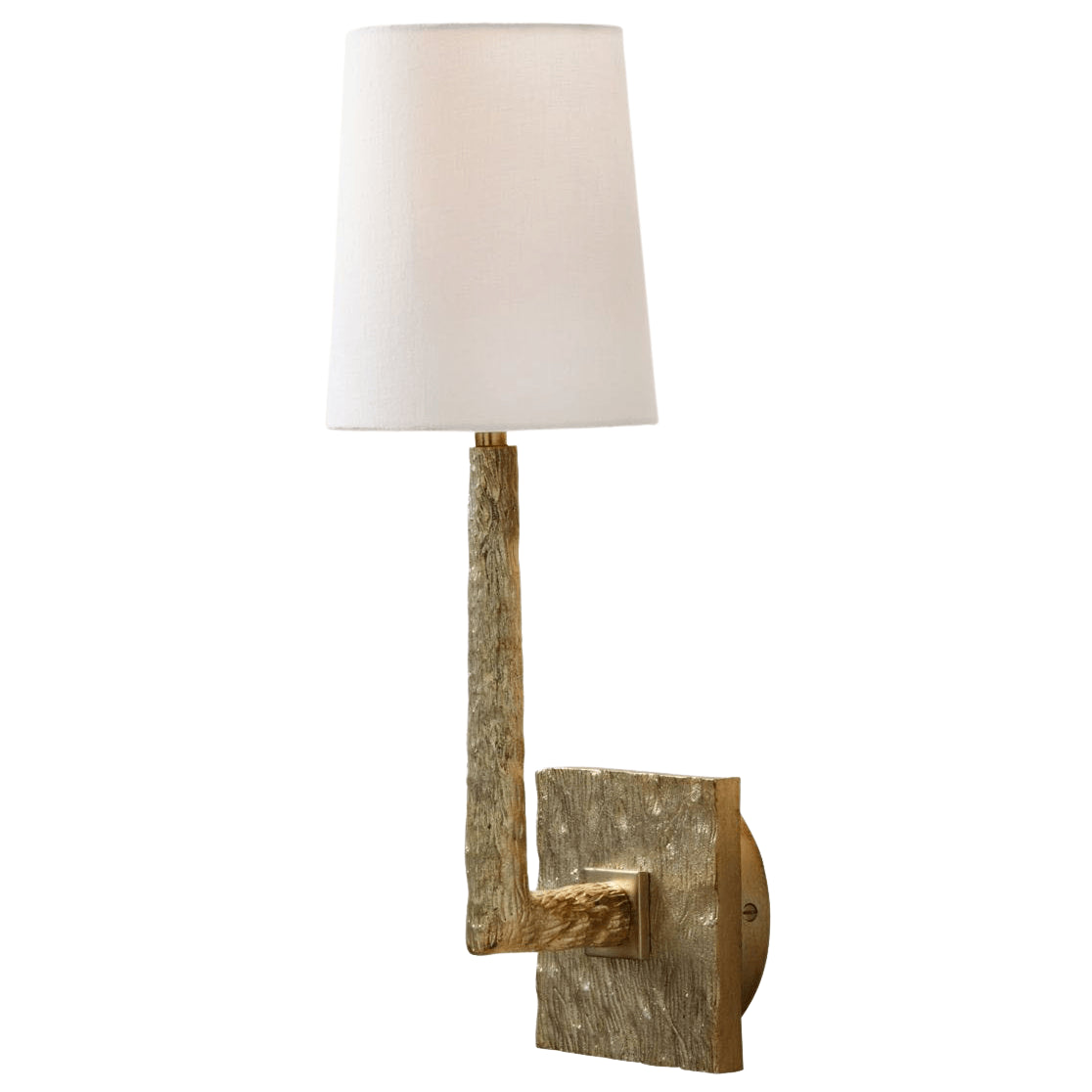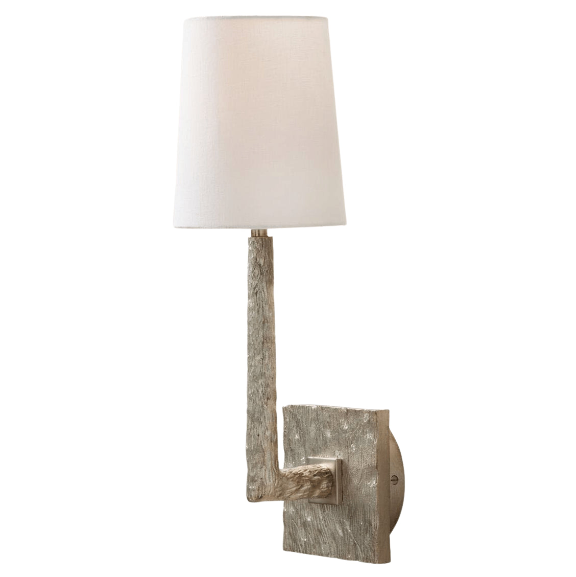 A minimalist take on the traditional torch sconce, Halton has a sleek armed silhouette finished in a faux bois antiqued brass or nickel finish.