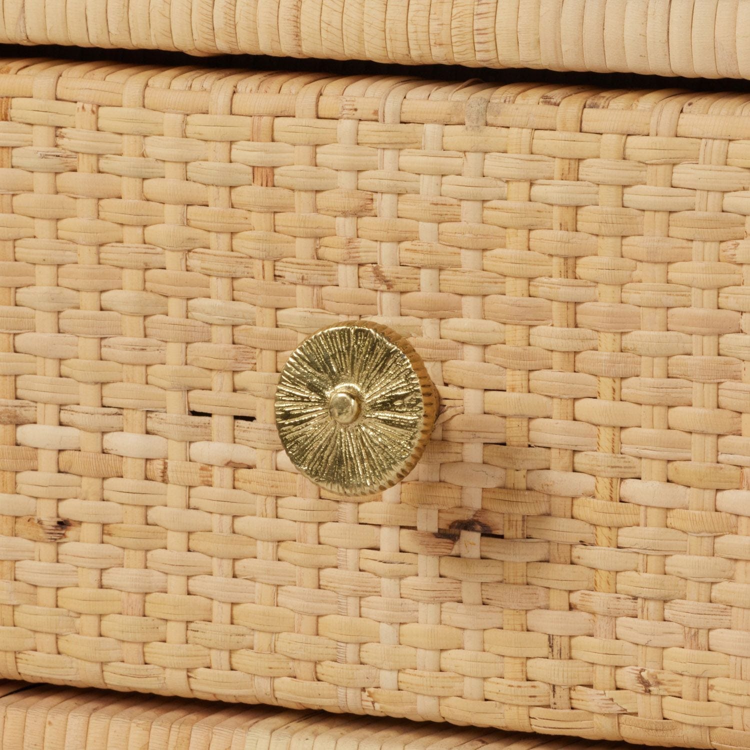 A tightly wrapped, natural peeled rattan frame, with slender legs reinforced by a box stretcher, supports an expansive, densely woven basket weave top. A piece of glass protects the material against the spills and stains of daily life. Soft-close front drawers with flower-patterned gold knobs, finished with a dark gray stained wood interior, offer storage for office necessities.