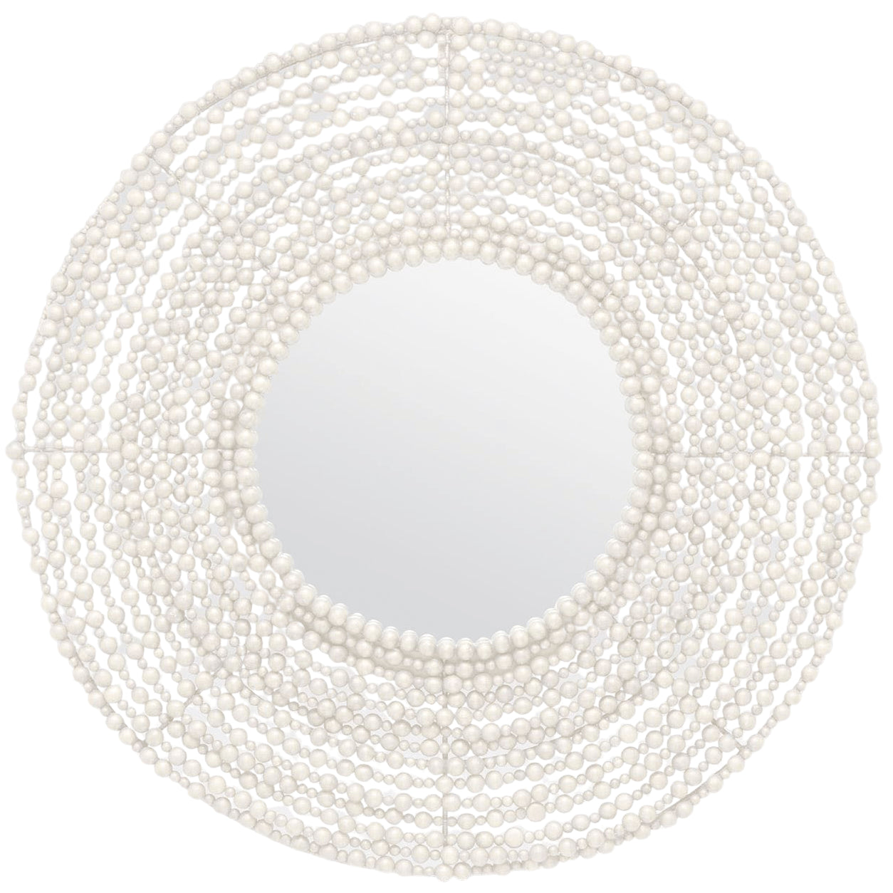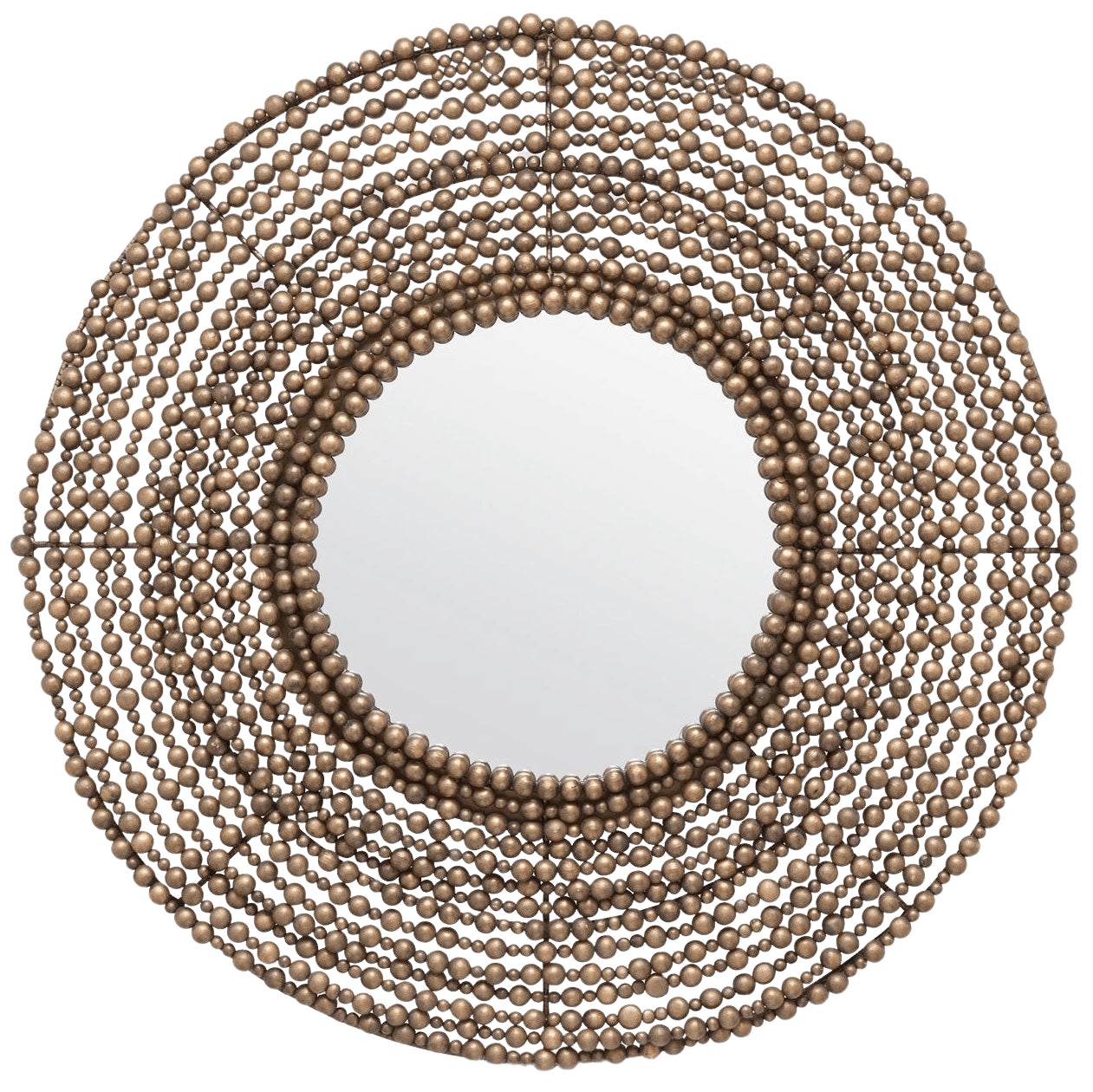 Varying sizes of wood beads have been painted bronze and white, then strung on wire to create the Jena's oversize macramé feel. Undulating rings give this piece movement and dimension; a loose structure opens it up.