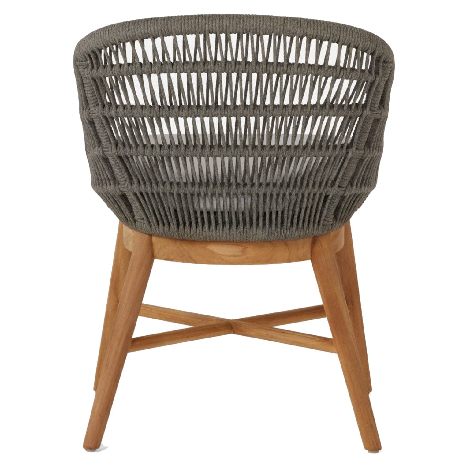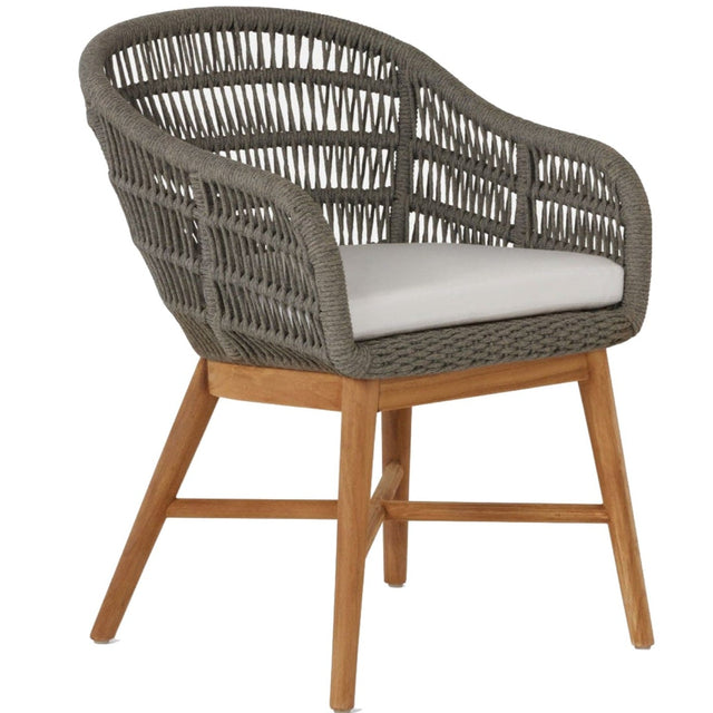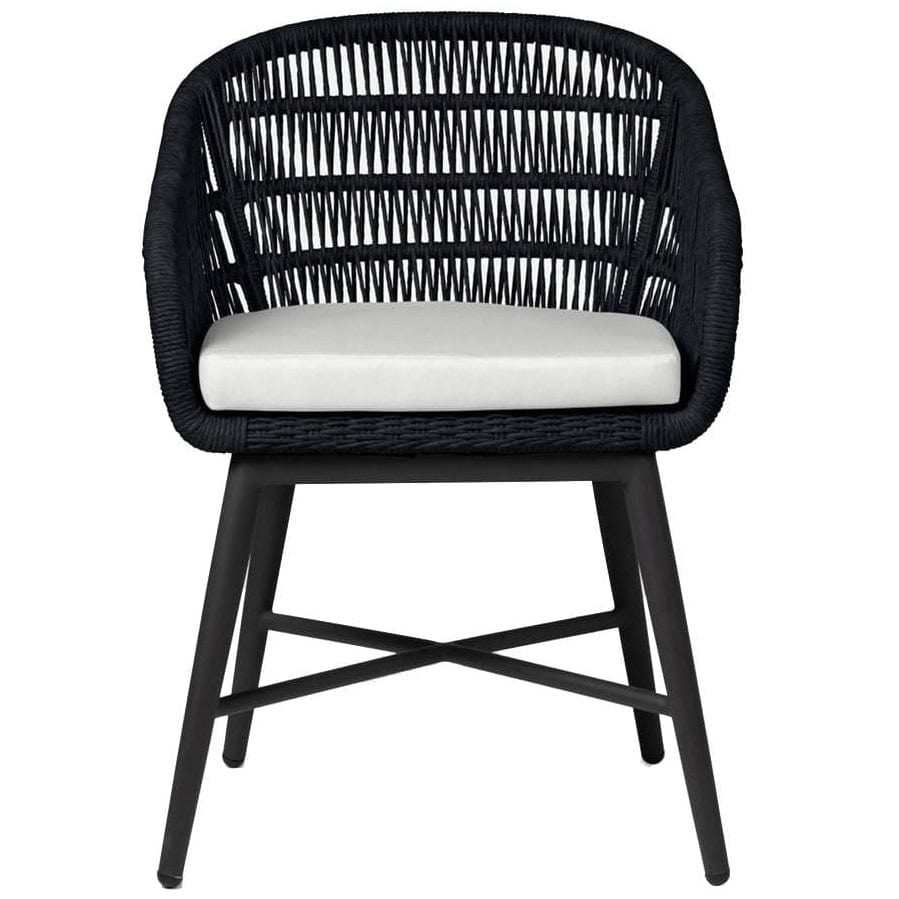 The Jolie's woven marine-grade rope and streamlined legs set the stage at an outdoor soiree. A curved back provides relaxed, comfortable, durable use. Cushion comes upholstered in our base fabric, Alsek White.