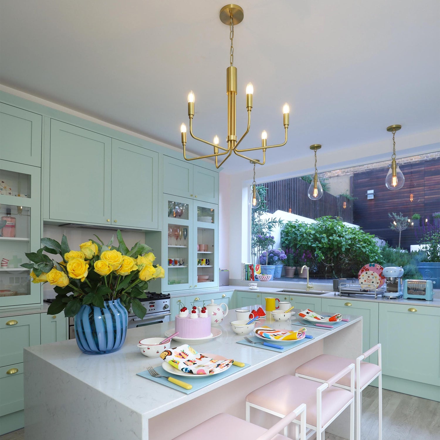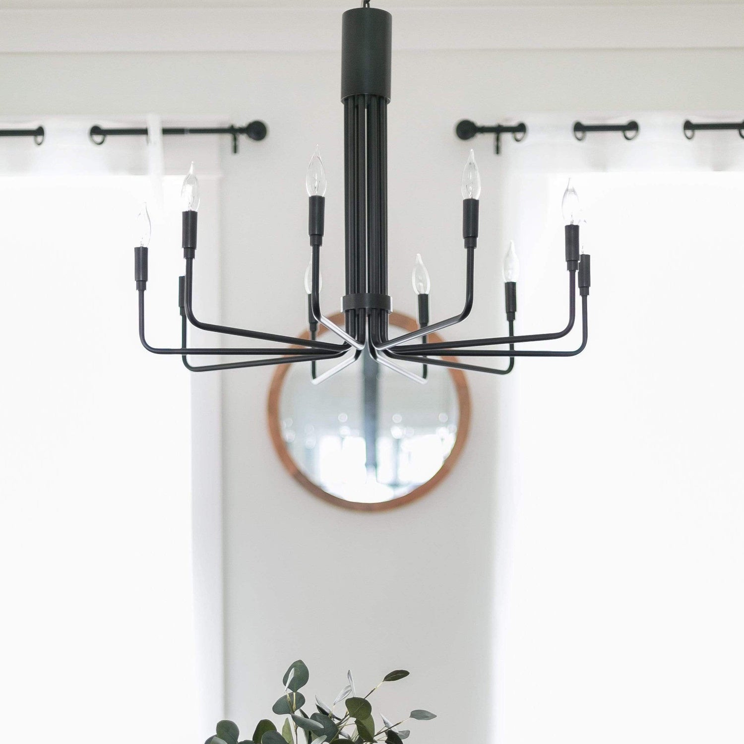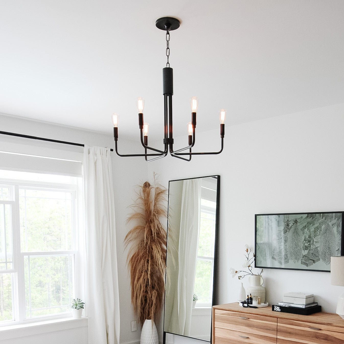 This elegant chandelier features a sleek brass finish and a minimalist six-arm design, each holding a candle-style bulb for a classic yet contemporary look. Perfect for dining rooms, entryways, or living spaces, it adds a touch of sophistication to any interior.