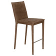 This contemporary counter-height stool features a minimalist design with clean lines, and it comes fully upholstered in rich Orris Brown leather. A sleek chrome footrest adds contrast, providing both comfort and understated sophistication for modern interiors.