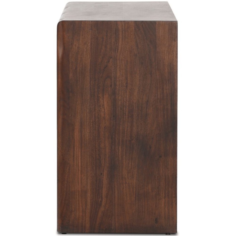 Made from solid acacia and finished in a rustic brown, a six-drawer, waterfall-shaped dresser features soft volume, mitered corners and a faux live edge.