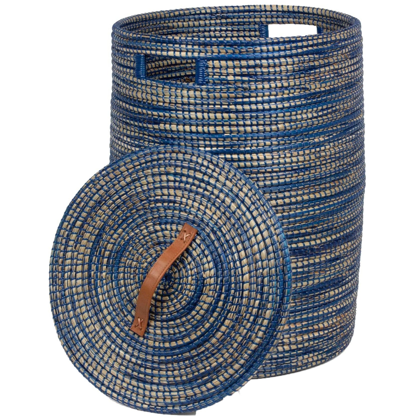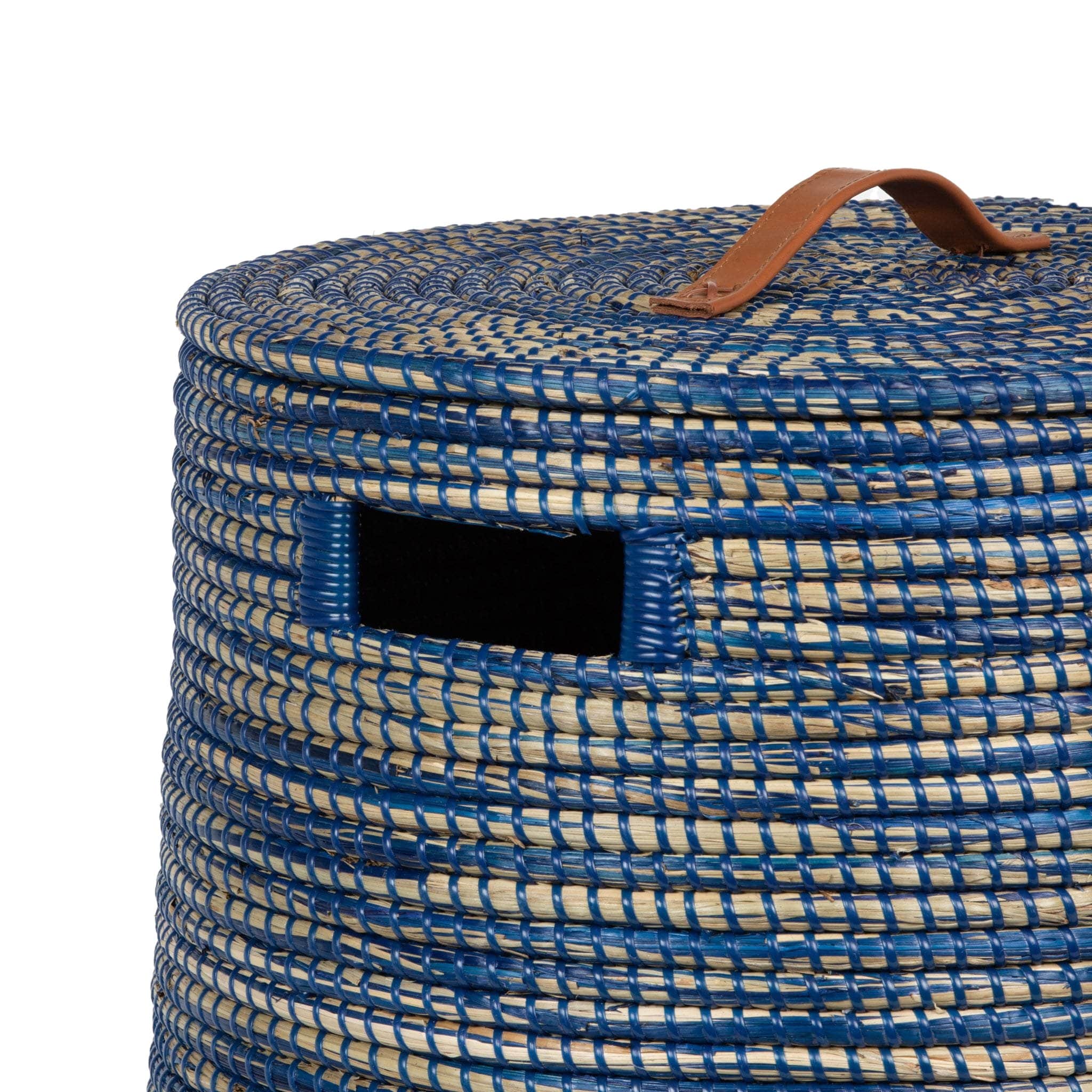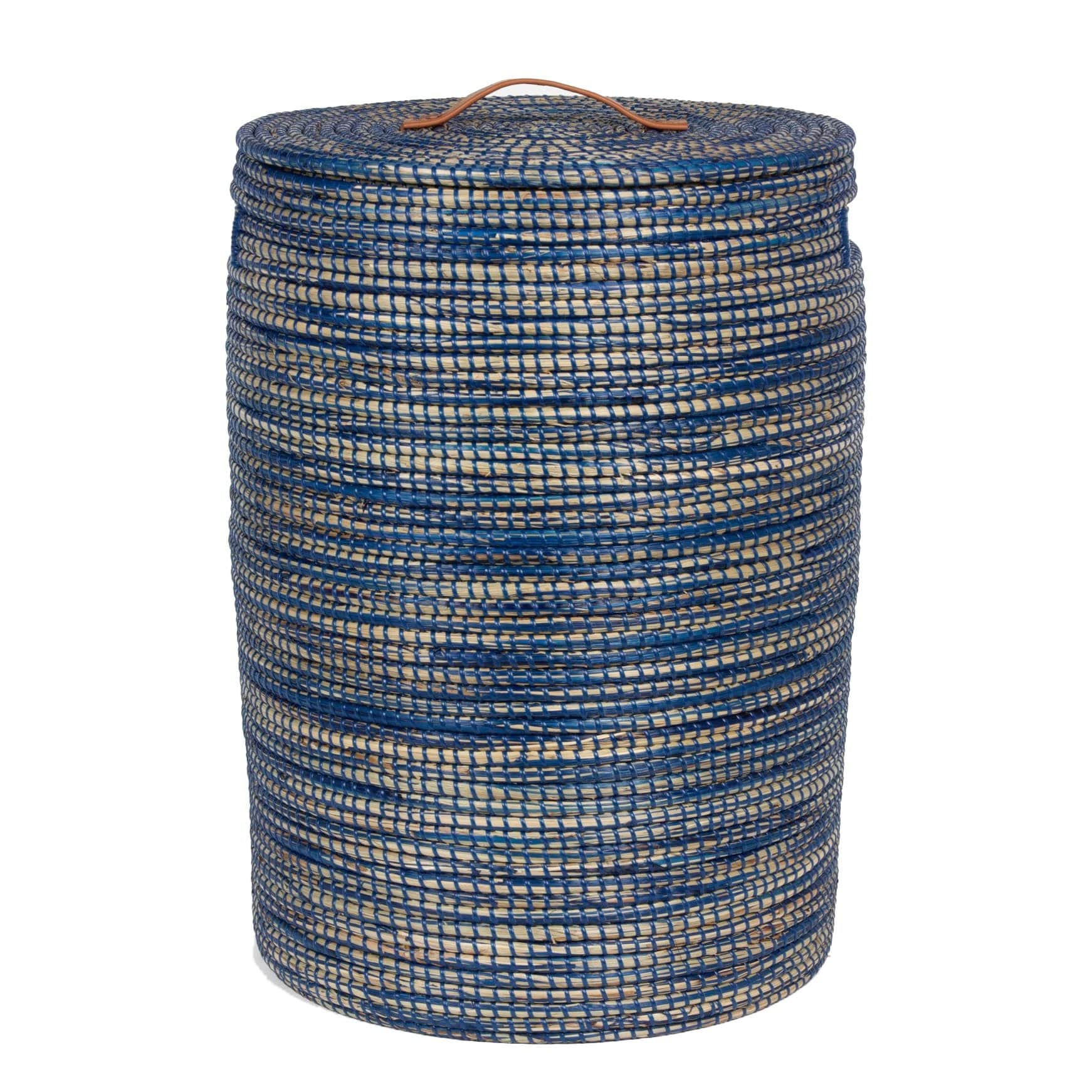 Dark blue hamper in tightly woven seagrass with leather handle.