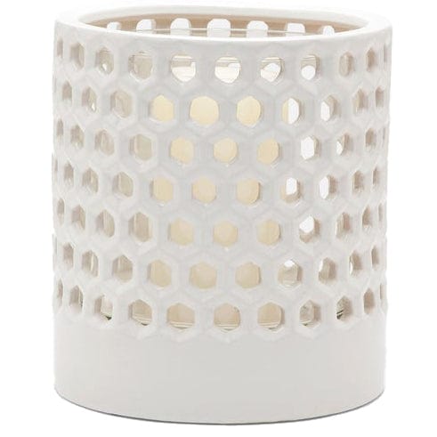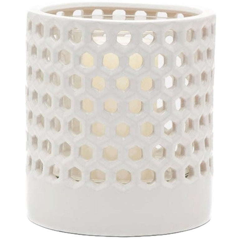 The hexagonal pattern of our glazed ceramic Banes creates a nice, graphic glow. Glass insert included.