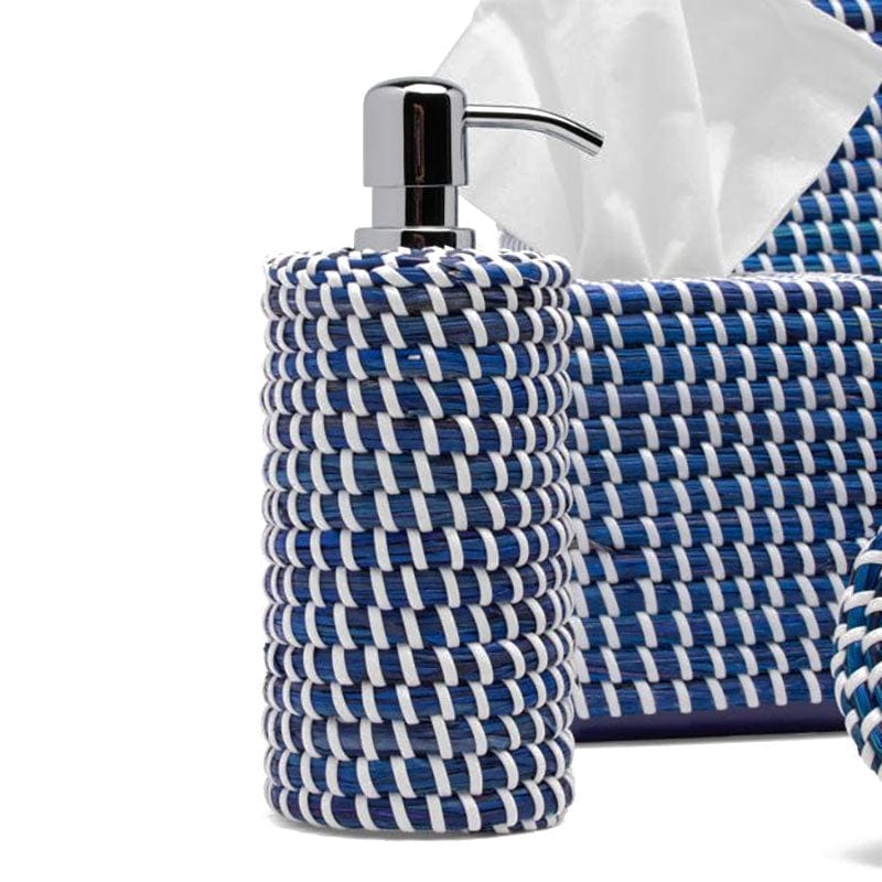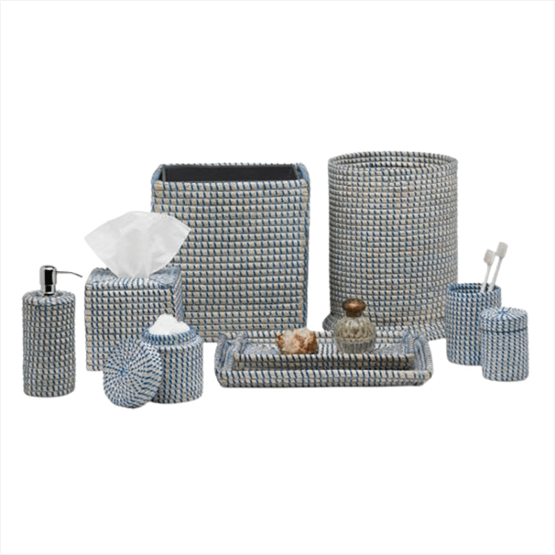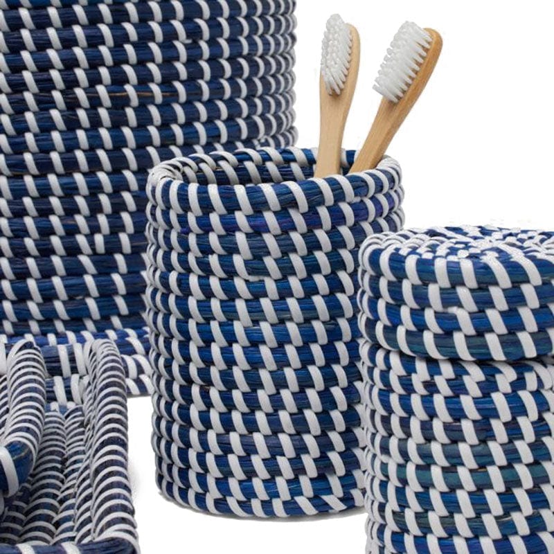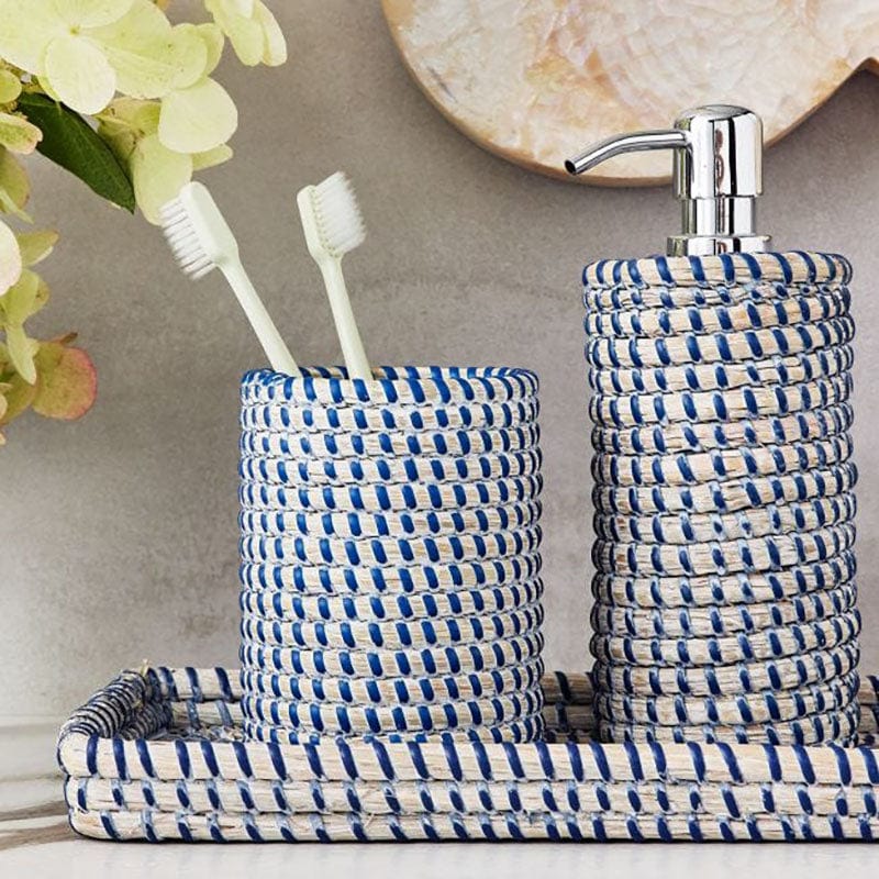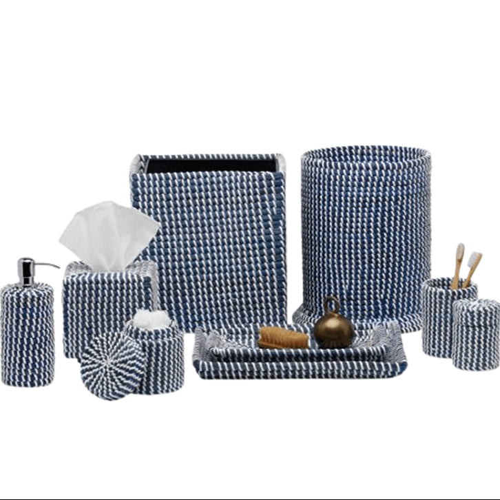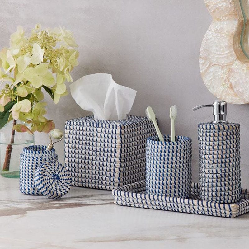 A high-contrast pattern skips across this nautical-meets-modern bath accessory collection.