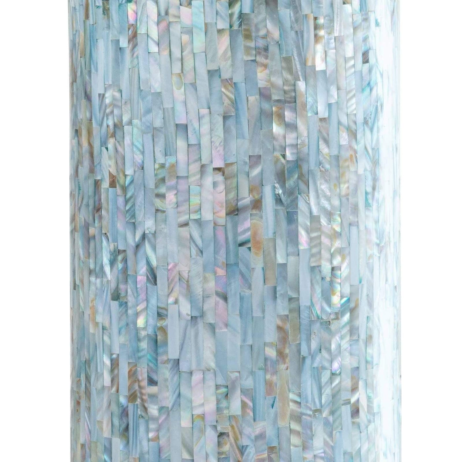 Like the shimmering light of the sun atop water, Layla's azure blue, mother of pearl tiles create the same dazzling effect. Place this modern column lamp in a seaside cottage or a contemporary loft, as it is the perfect chameleon of style, adding a bit of drama and elegance to any space it dwells in. Finished with a classic drum shade in natural linen, this is the perfect, substantial lamp for an end table, bed stand or entryway console.