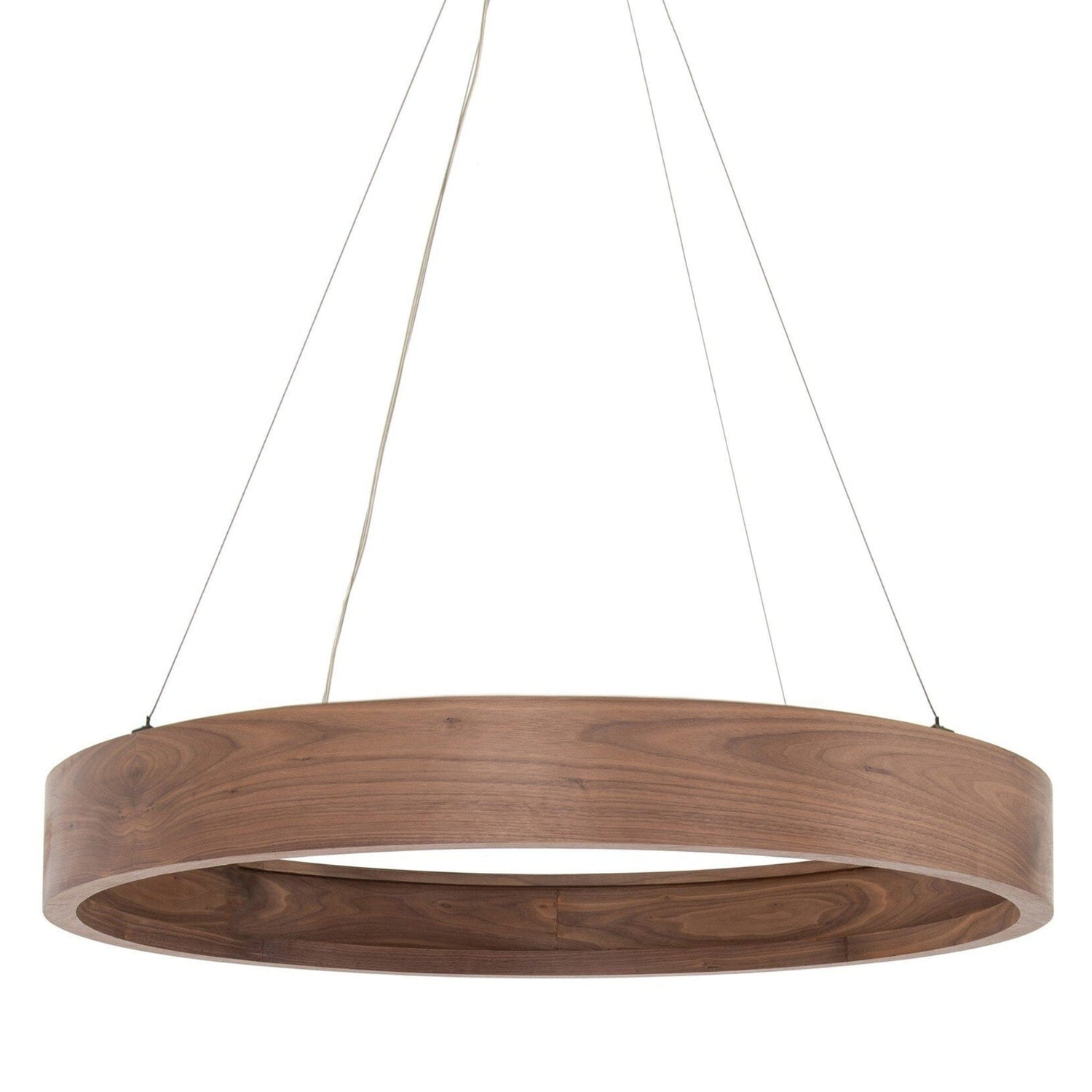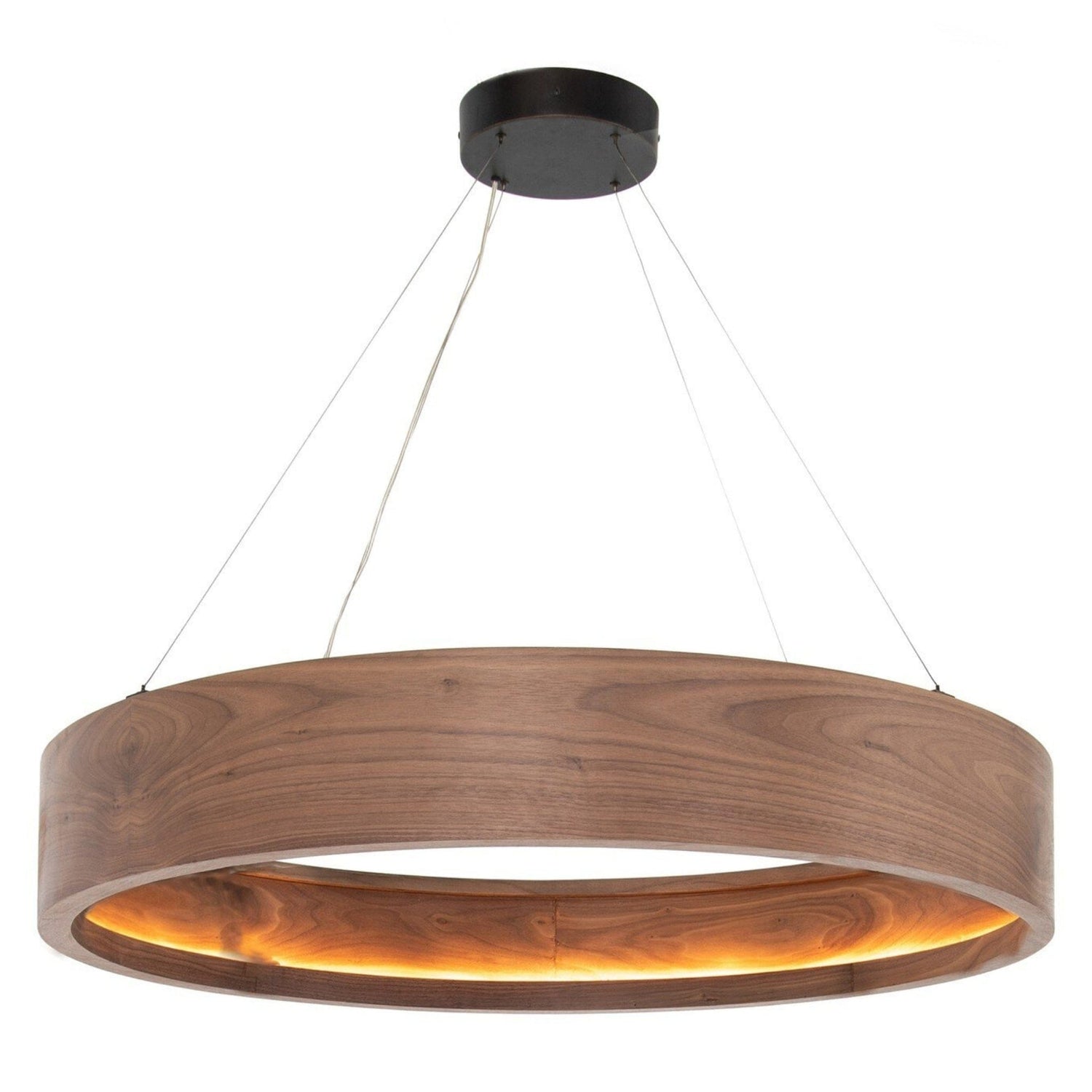 Light up the room with a beautifully rounded chandelier of dark-finished walnut veneer with bronzed stainless steel suspension. Emitting a soft, ambient glow, LED lighting strip (included) stays concealed for sleekness. Fixture can be altered for dimmability - contact a certified electrician only for adjustments. Four Hands does not accept responsibility for damage done to lighting during this process. Not recommended for sloped ceilings.