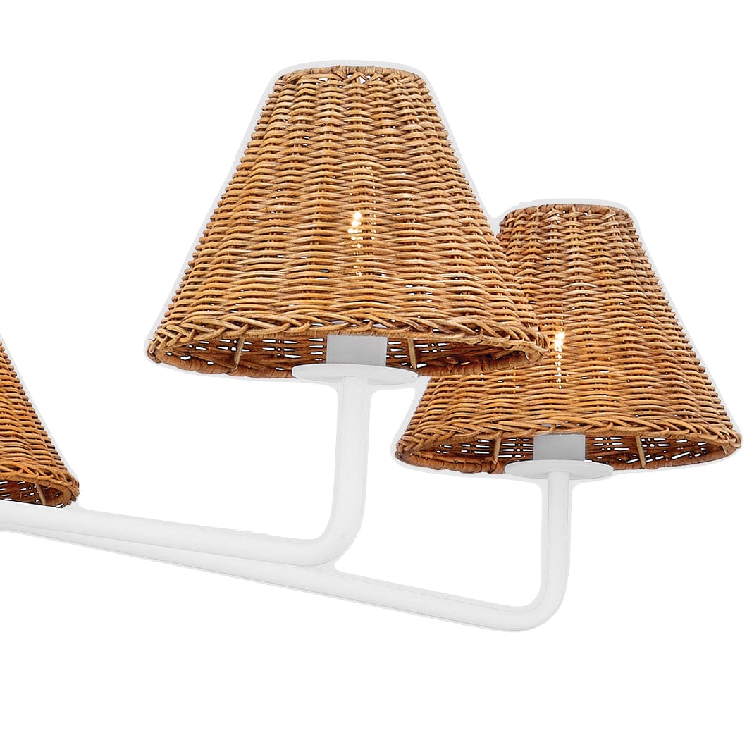 Issa has a natural style that's ahead of the curve. Slender, hooked arms hold a woven rattan shade that lets a soft light filter through. The aged brass or textured white finish is the perfect complement to the natural shade and adds to the fixture's overall earthy feel. Available as a chandelier, wall sconce or portable sconce, there's a place for Issa in every space.