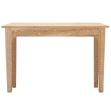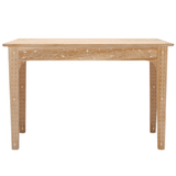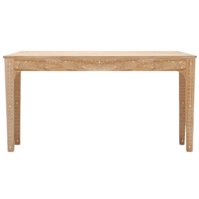 Our Tamsin collection is expertly crafted to elevate the beauty and comfort of your indoor space, creating a sanctuary of inspiration. Solid teak features an intricate bone inlay pattern on the tabletop, apron, and legs. The natural beauty of teak ensures that no two pieces are exactly alike - variations in color and tone are to be expected.
