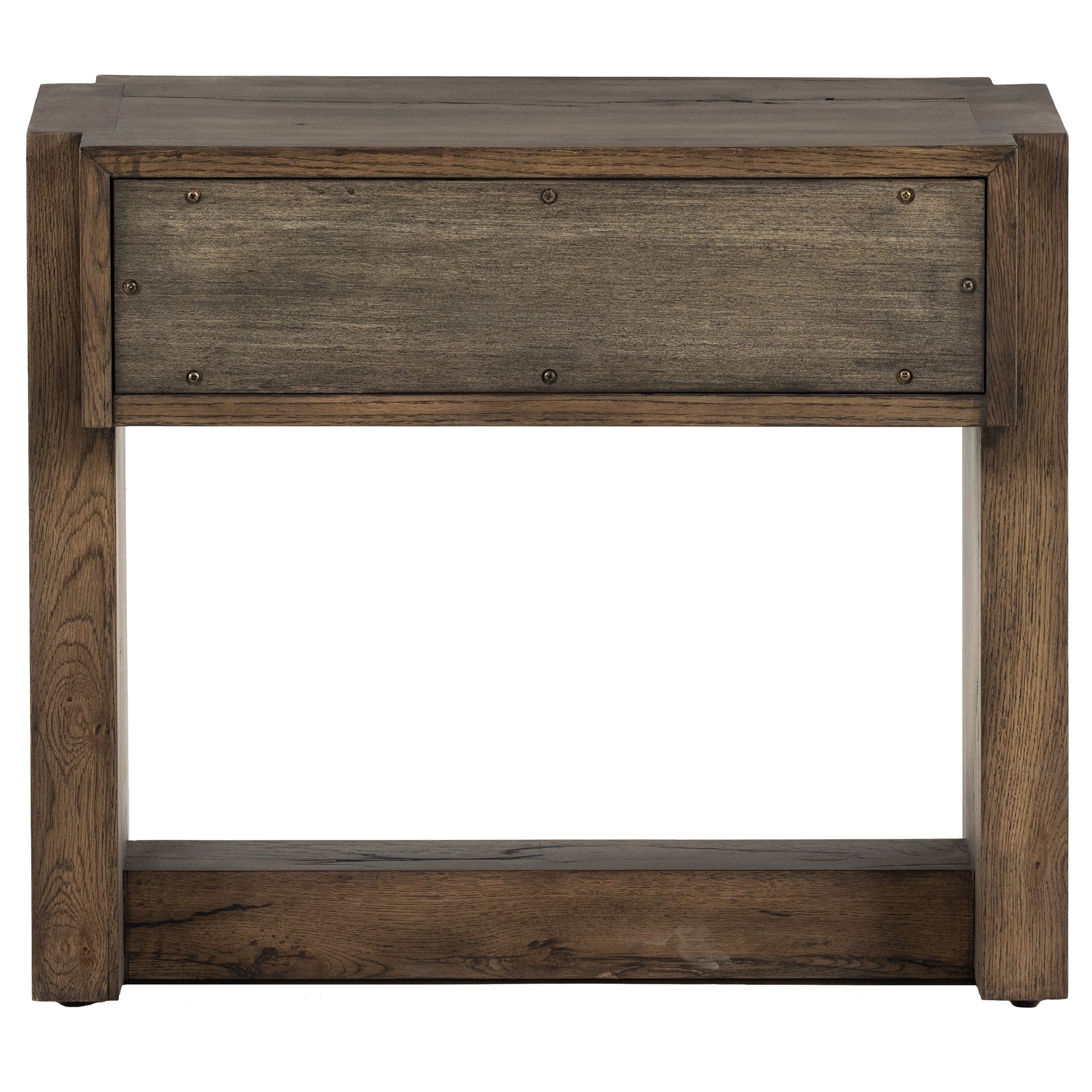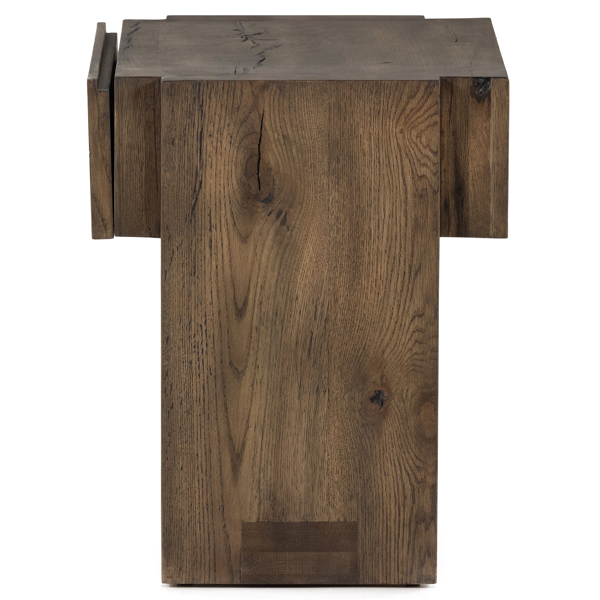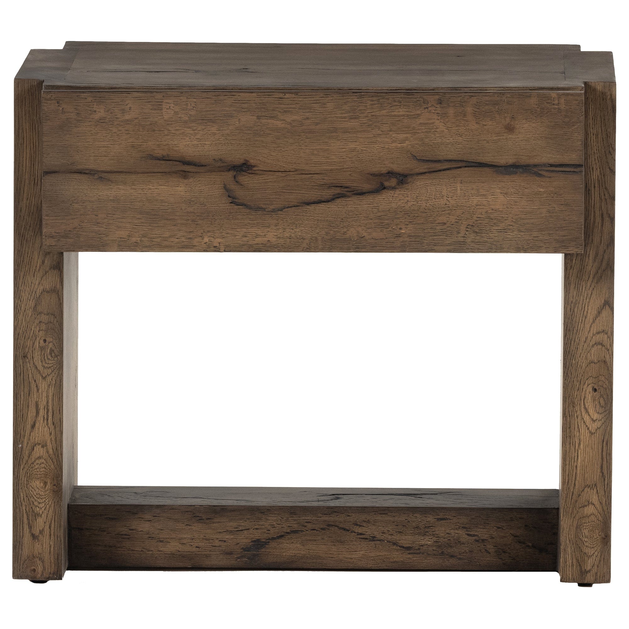 Made from solid oak and oak veneer, visible knots and graining play up the natural beauty of this stylish nightstand, with overscale joinery for extra heft.