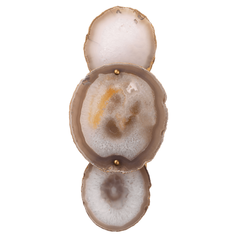 Three unique slices of natural agate stone are individually arranged to create extraordinary pieces of art. Embrace this wall sconce's individuality and you will have a truly one-of-a-kind piece on your wall.
