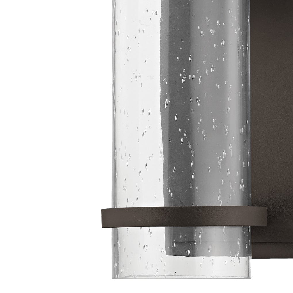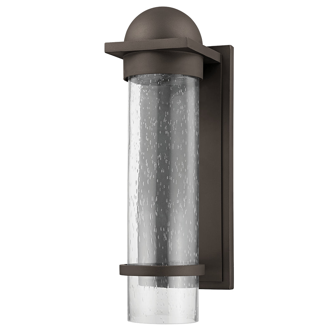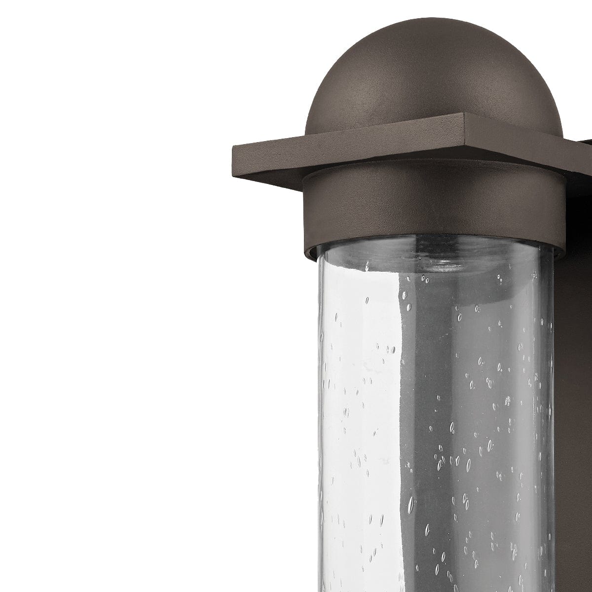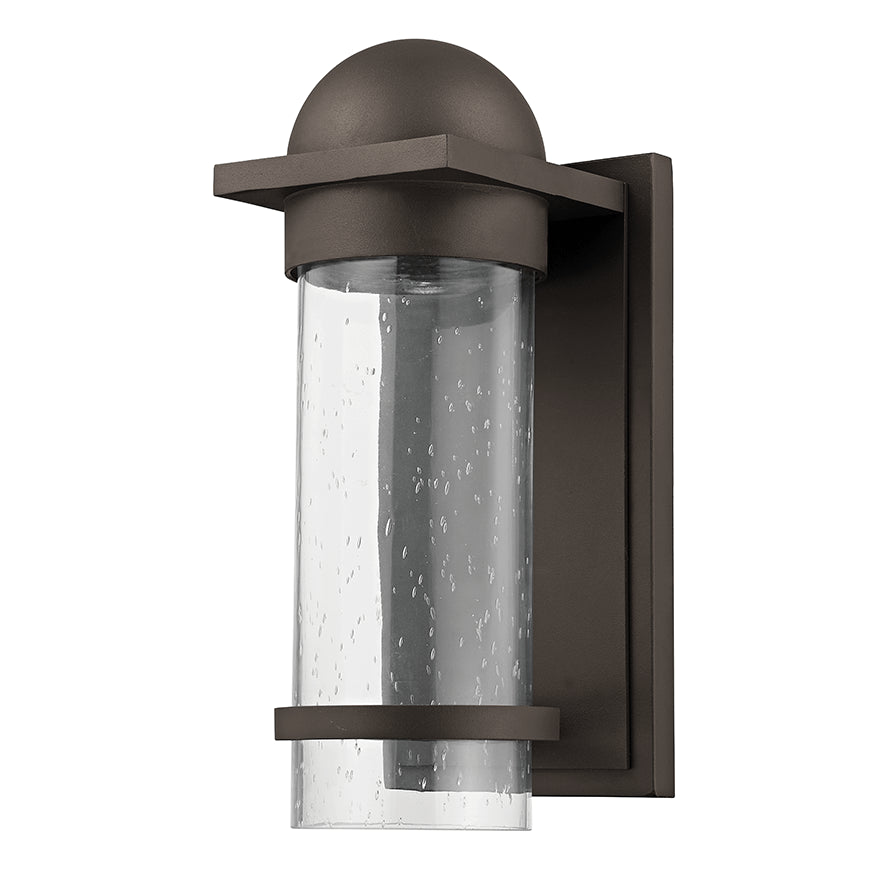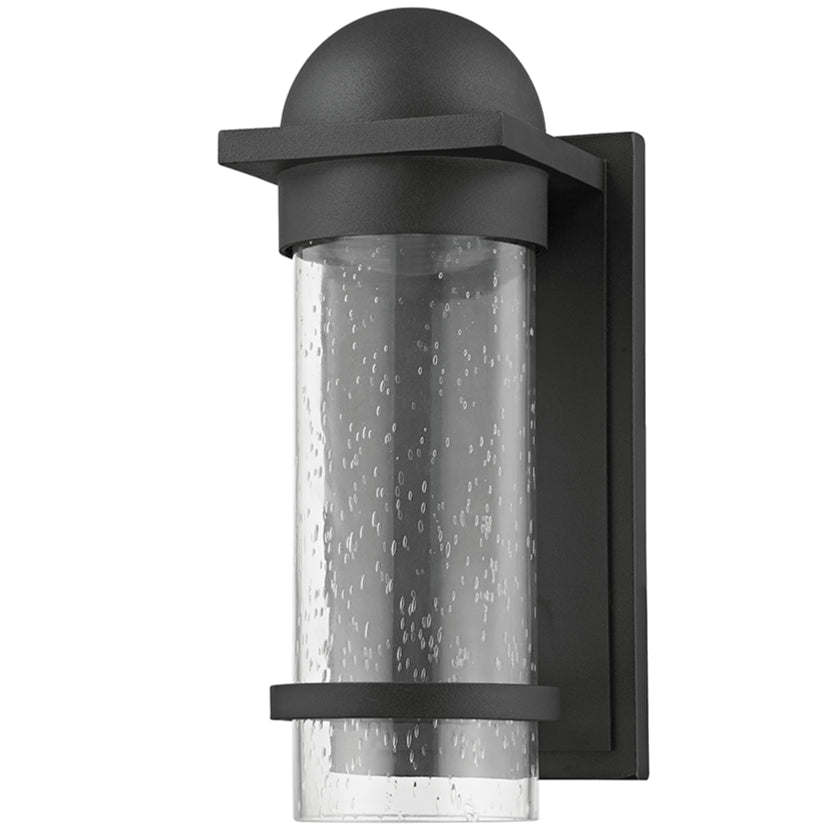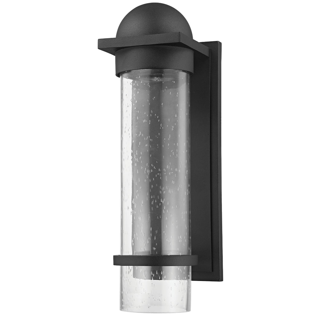 Nero takes modern industrial to new heights, pairing dark finishes with clear seeded glass for an unexpected twist. A large backplate anchors the design, grounding the tubular light fixture. The linear silhouette is accented with metal bands, finished in textured black. Dark sky compliant.