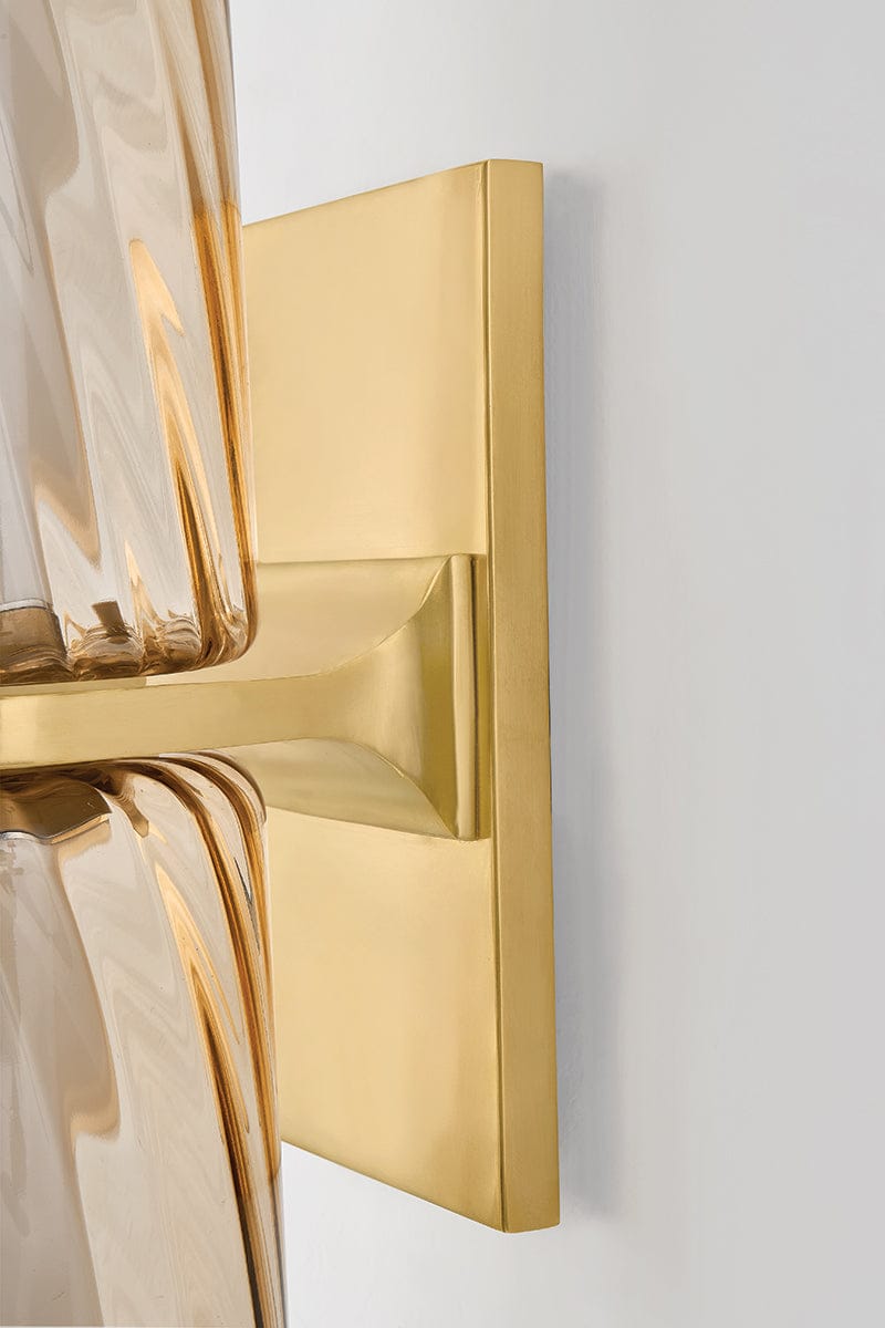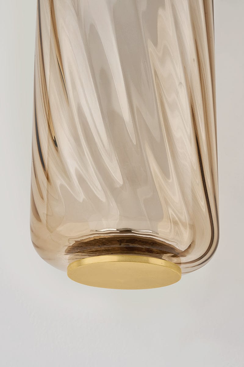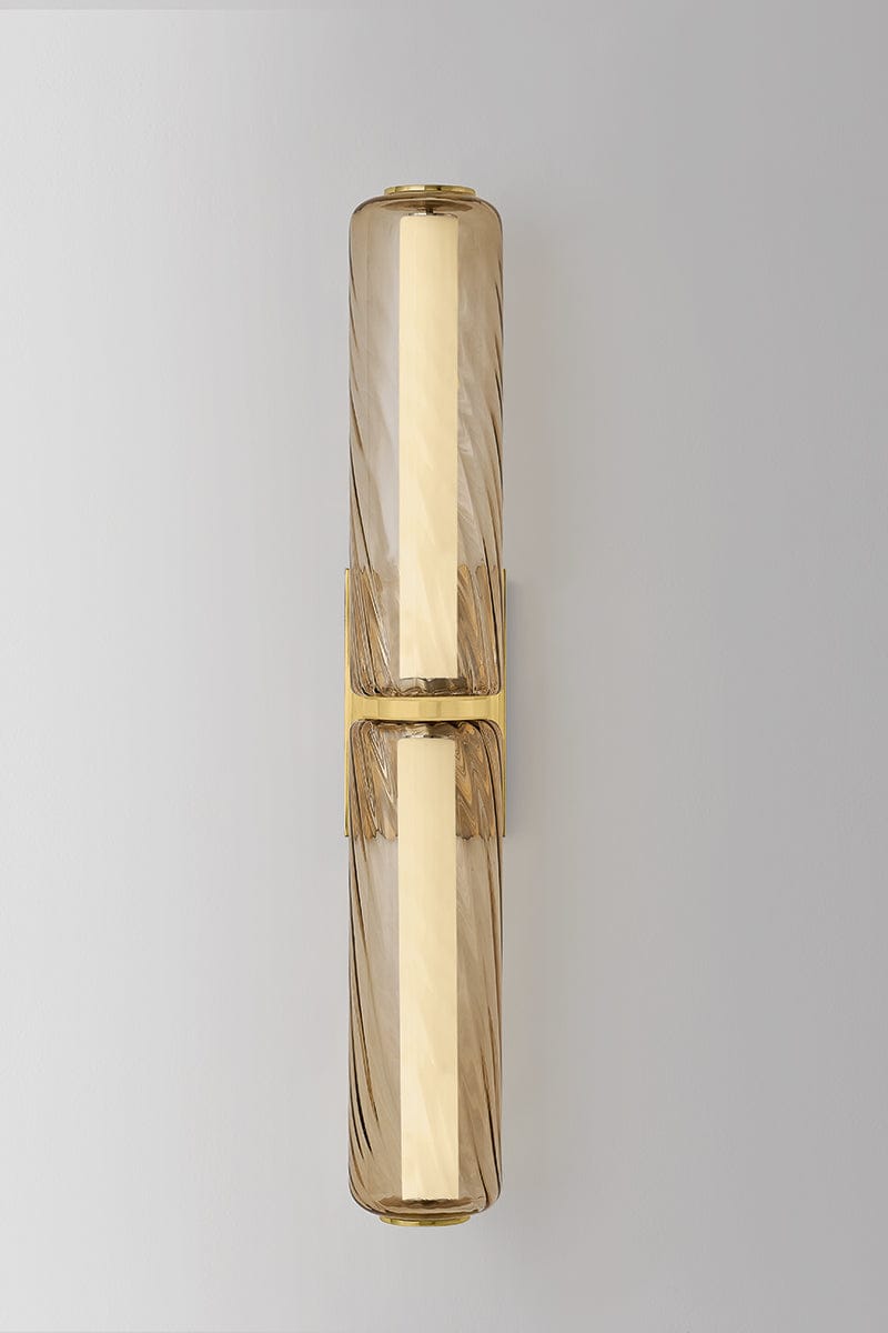 As memorable as the Tuscan sun, this wall sconce is characterized by a slender, elongated silhouette made from eye-catching clear topaz swirl glass. A full-length LED tube illuminates each shade, creating a sense of movement as light diffuses through the twisted glass. A smooth metal band finished in Vintage Brass cinches the center, adding a moment of visual rest to balance the fixture’s maximalist scale. Tuscany transitions beautifully from living spaces to bath and powder rooms.