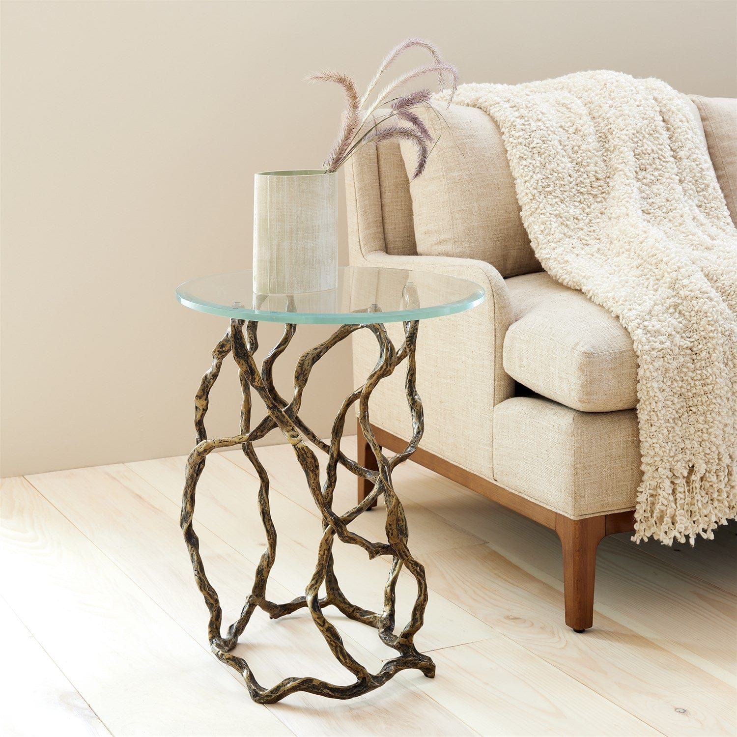 The Twistwood Tables are handcrafted from cast iron with an antique brass finish, seamlessly combining the essence of nature with understated tempered clear glass surfaces.