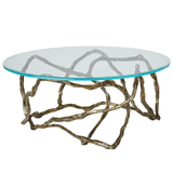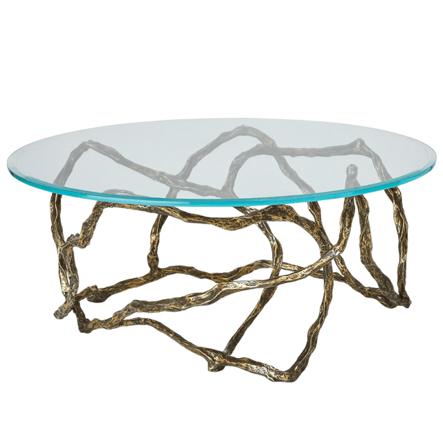 The Twistwood Tables are handcrafted from cast iron with an antique brass finish, seamlessly combining the essence of nature with understated tempered clear glass surfaces.