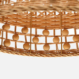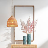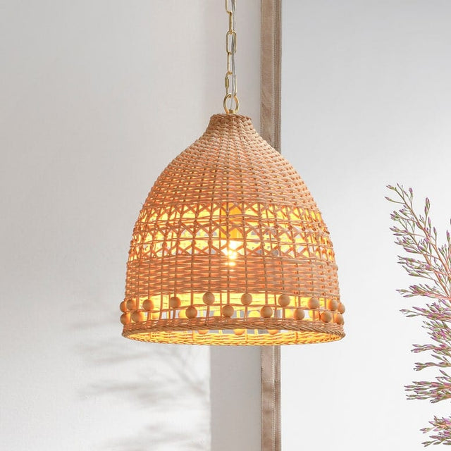 Every corner of our Vishal pendant light is a celebration of texture. A chic chain rope drops down from a classic circular base into a tightly woven rattan shade, accented with triangular and circular wooden details. Cast a subtle warm light with varied shadows in any room.