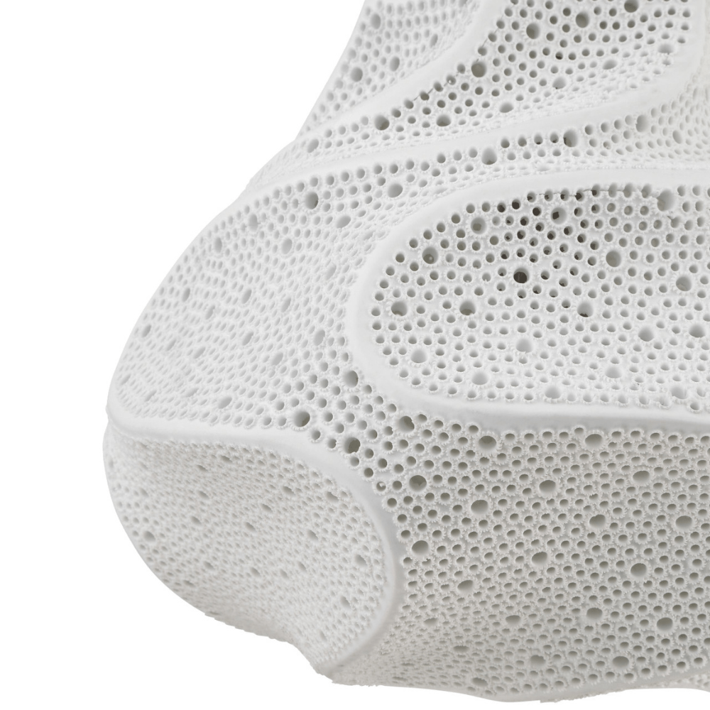The Wintershall Pendant has an organically-shaped shade with a flowing pattern that is painstaking to achieve. The porcelain comes from the kiln as a solid form that is then hand-drilled with two sizes of holes; the uniformity the artisans produce when they are creating the openings very difficult to do. The one-light pendant is dimmable.