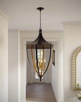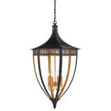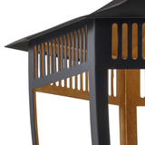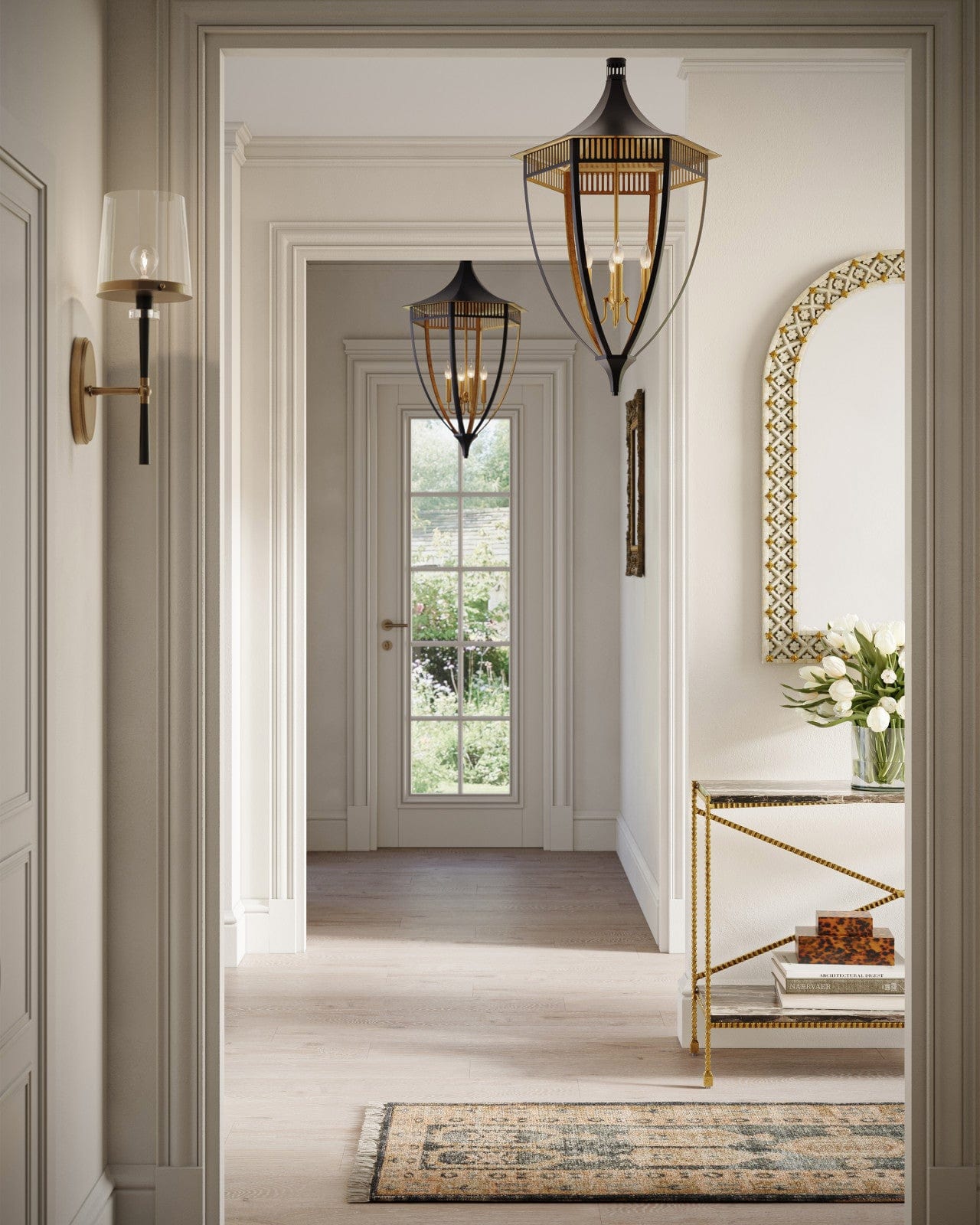In the Bunny Williams Collection, the Wycombe Lantern has the classic lines for which this lauded designer is known. Made of wrought iron, the refined lantern is finished in a mix of satin black and contemporary gold leaf finishes. Because the interior of the black lantern is covered with gold leaf, the illumination coming from it will warmly glow. The grillework that runs along its circumference where it meets the domed top is an elegant feature.